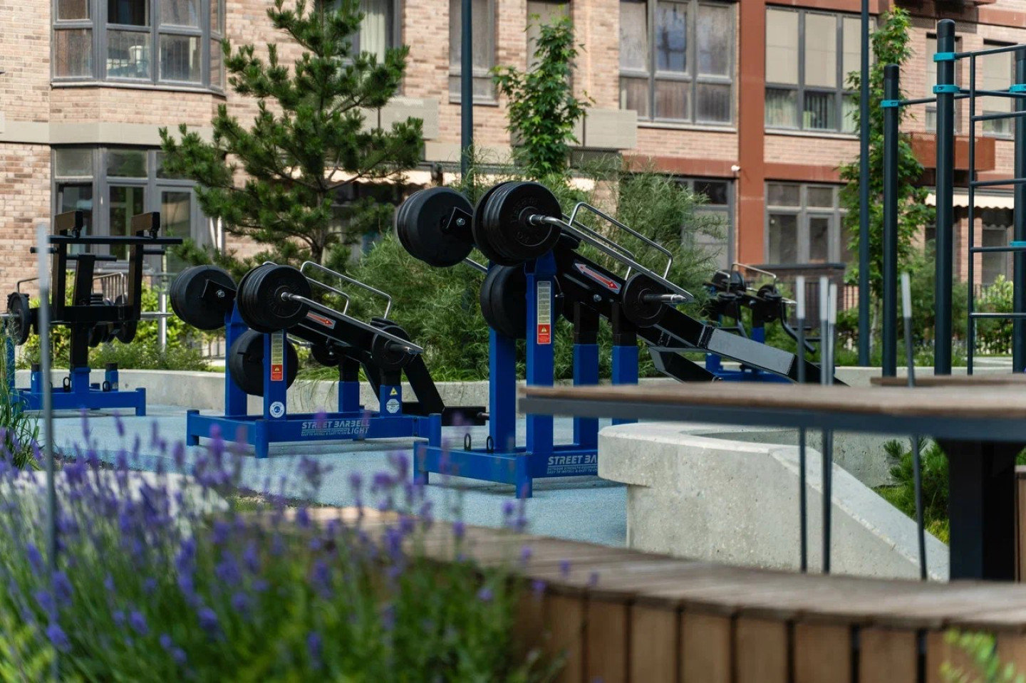 Общая территория комплекса — более 23 га. Она позволяет сохранить большое расстояние между домами, озеленить дворы и разместить детские городки, деревянные беседки, лавочки, проложить велодорожки и аллеи. И создать спортивный кластер, где есть скейт-парк, тренажеры, площадки для разных видов спорта, теннисный корт с безопасным покрытием. Велодорожки проходят параллельно аллеям по всему периметру ЖК так, чтобы маршруты велосипедистов и пешеходов не пересекались.