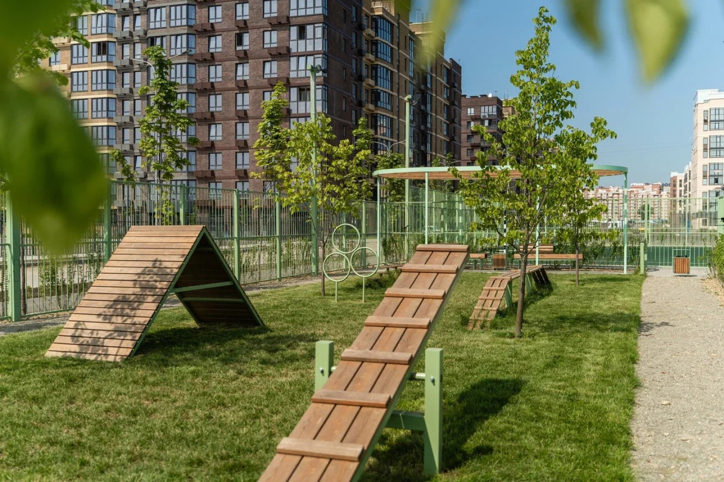 Пространство второй очереди обустроено в экостиле — со множеством зеленых насаждений, зонами отдыха из природных материалов, натуральными газонами, где можно отдыхать, играть, заниматься спортом. Владельцы домашних животных могут выгуливать своих питомцев на специальной тренировочной площадке.
