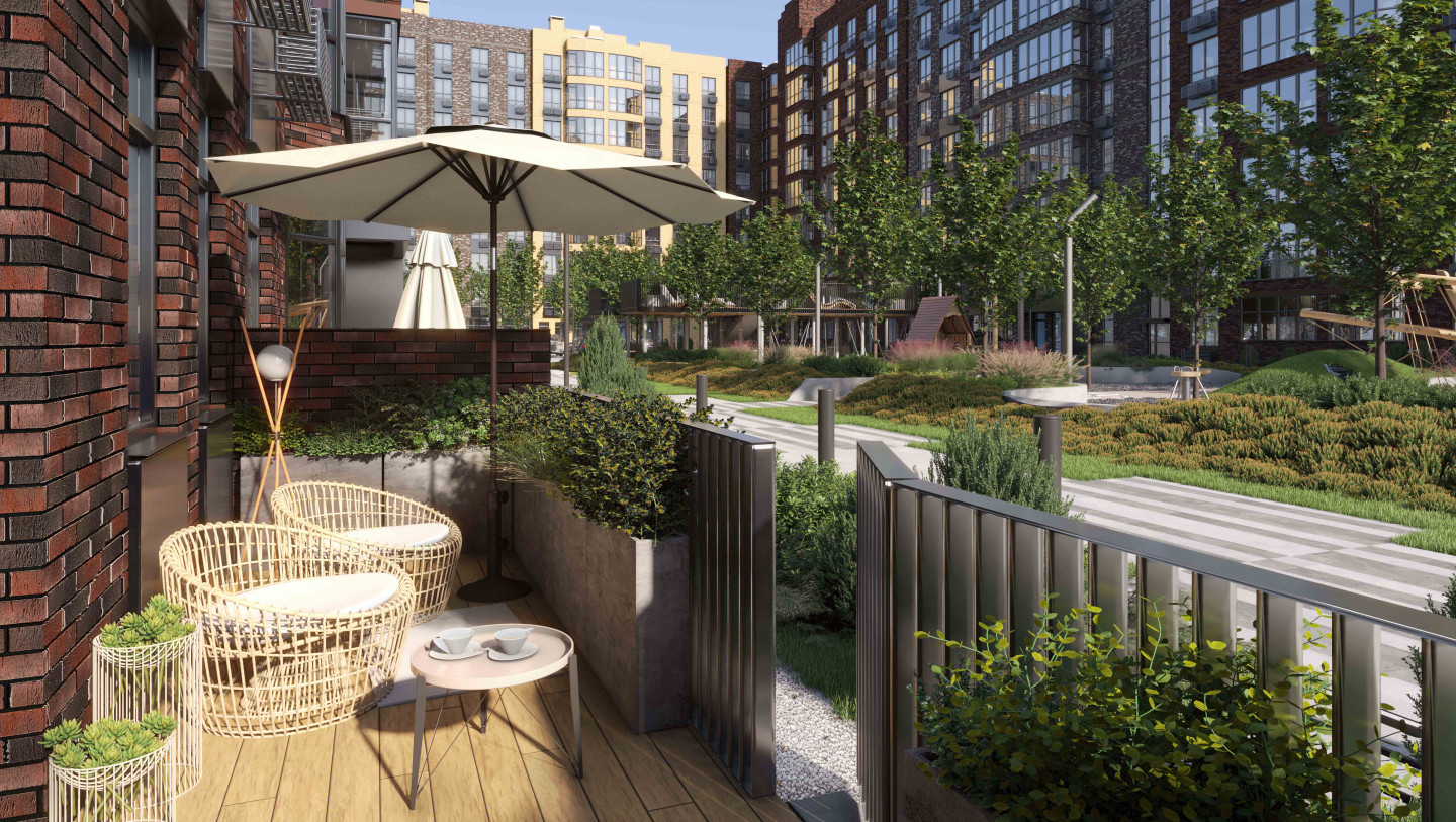 Здесь есть первые в городе квартиры с террасами на первом этаже — благодаря им вы воплотите мечту о собственном дворике, не покидая мегаполиса.