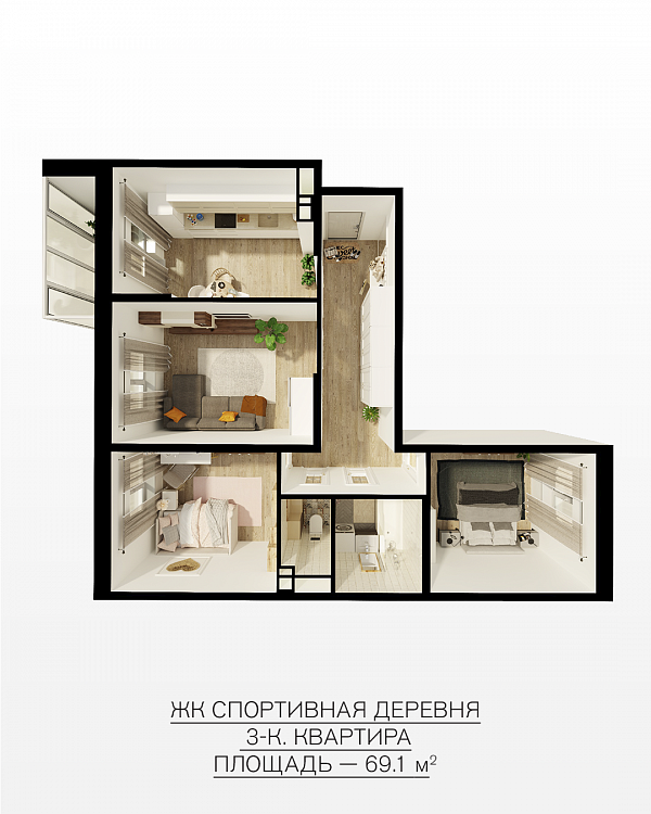 3. «Трешка» в литере 14 ЖК Спортивная деревня , площадь — 69,1 кв. м.
