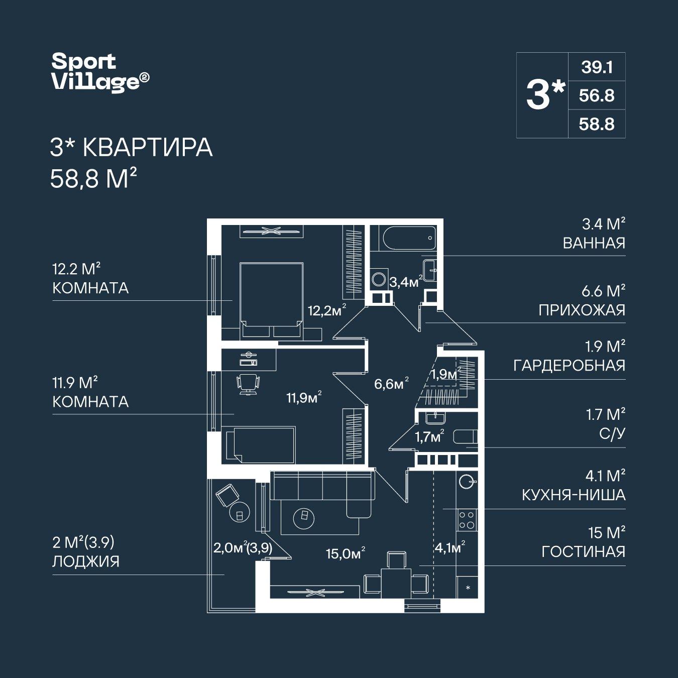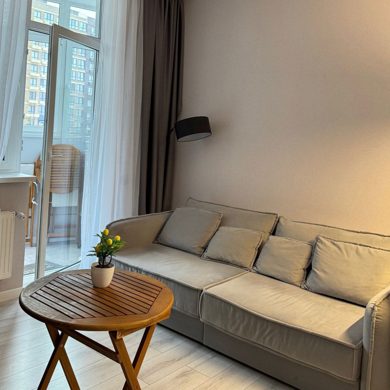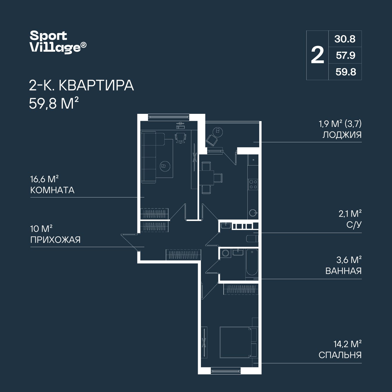 А вот это — дань современному тренду. По сути, та же 2-комнатная, но с большой, объединенной кухней-гостиной. В квартирах ЖК Sport Village из нее также есть выход на видовую лоджию.