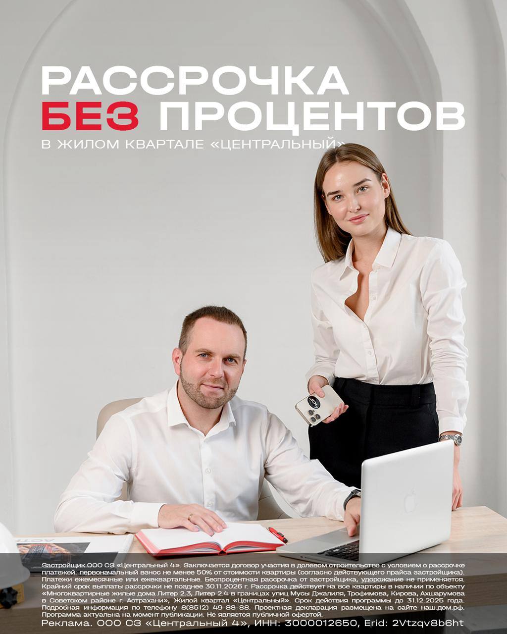 Реклама. ООО СЗ «Центральный 4», ИНН: 3000012650, Erid: 2Vtzqv8b6ht