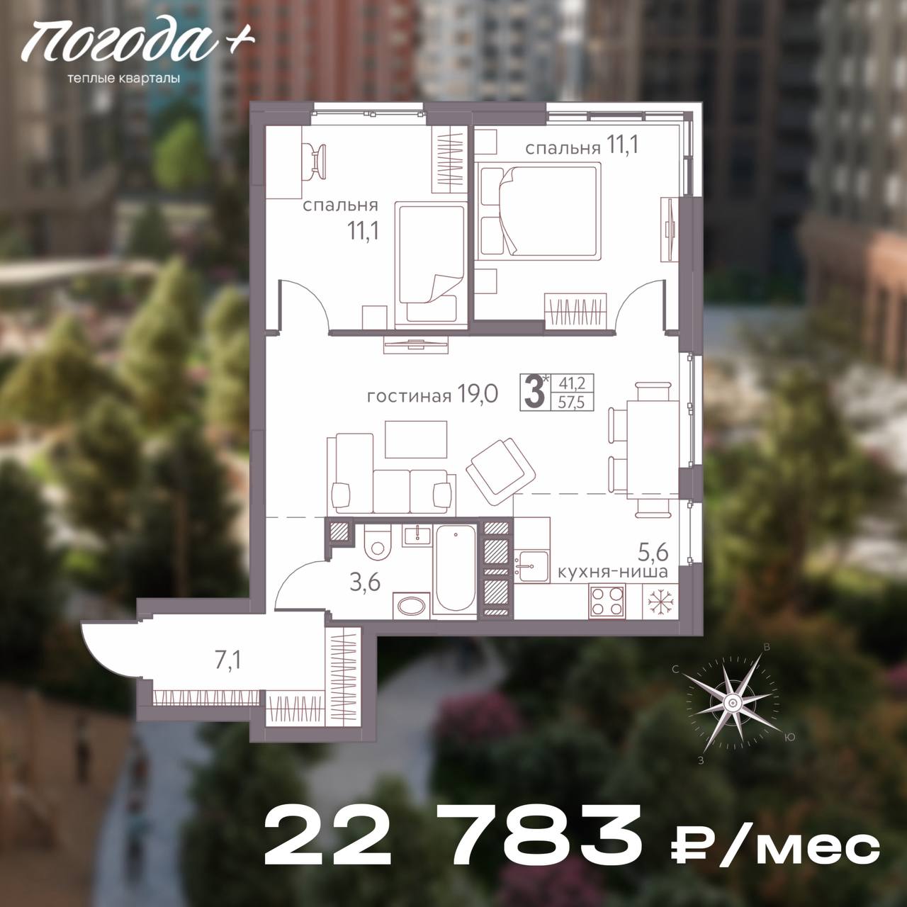 Для Евро-3 с угловым остеклением и просторной кухней-гостиной 24,6 м² платёж составит 22 783 ₽/мес. Отделка уже включена в стоимость!