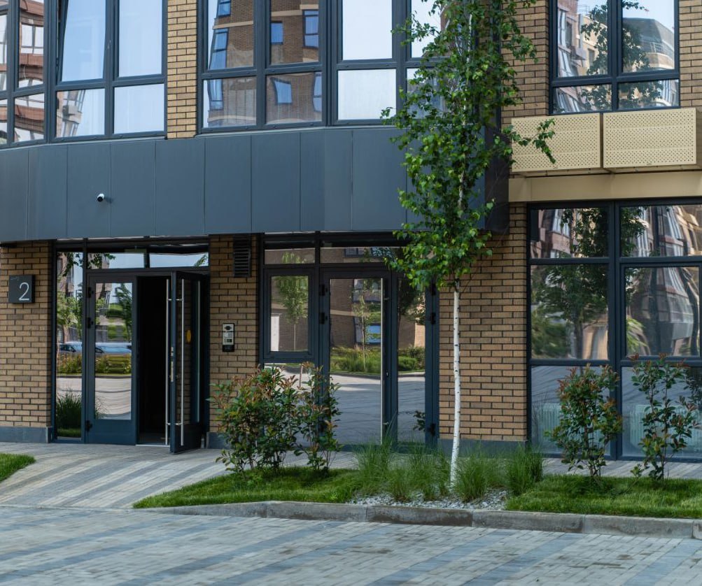 Входные группы в Sport Village — на уровне тротуаров, без громоздких ступенек и пандусов.
