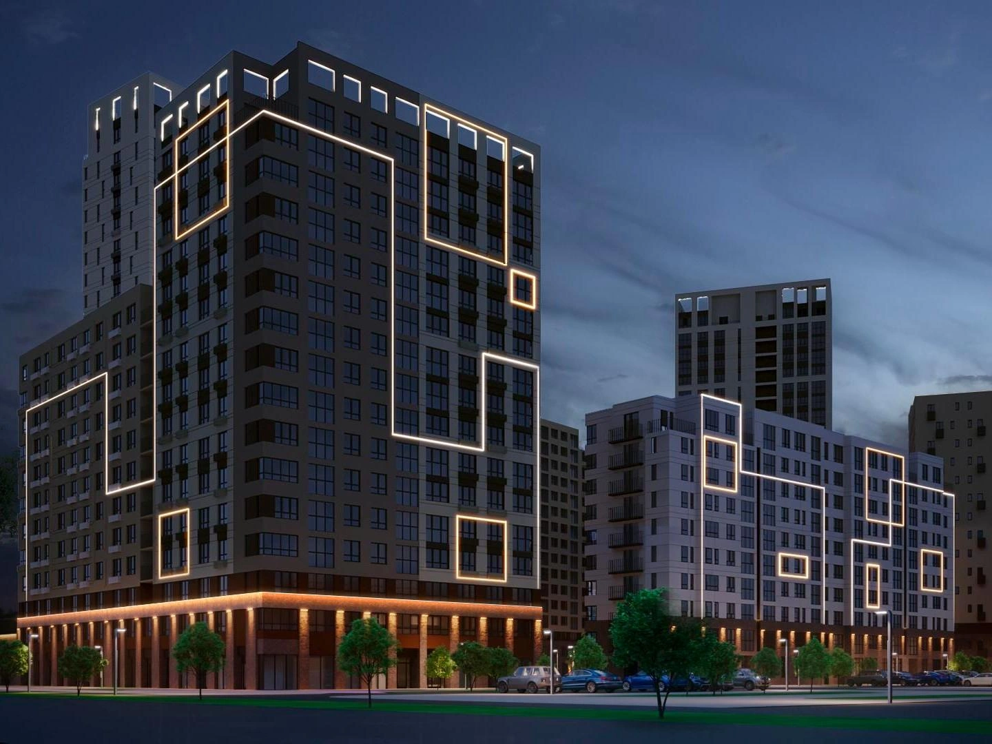 Фасады жилого квартала «А+» выполнены в современных стилевых и цветовых решениях, а их повышенные теплоизоляционные свойства делают проживание еще более комфортным и экономичным. Современное архитектурное освещение уже давно вышло за рамки простой функциональности и создает эмоциональную связь между архитектурой и людьми. Дома жилого квартала «А+» имеют разную высотность, что позволило сформировать узнаваемую и разнообразную архитектурную среду. Акцентное освещение фасадов сохраняет их облик в темное время суток.