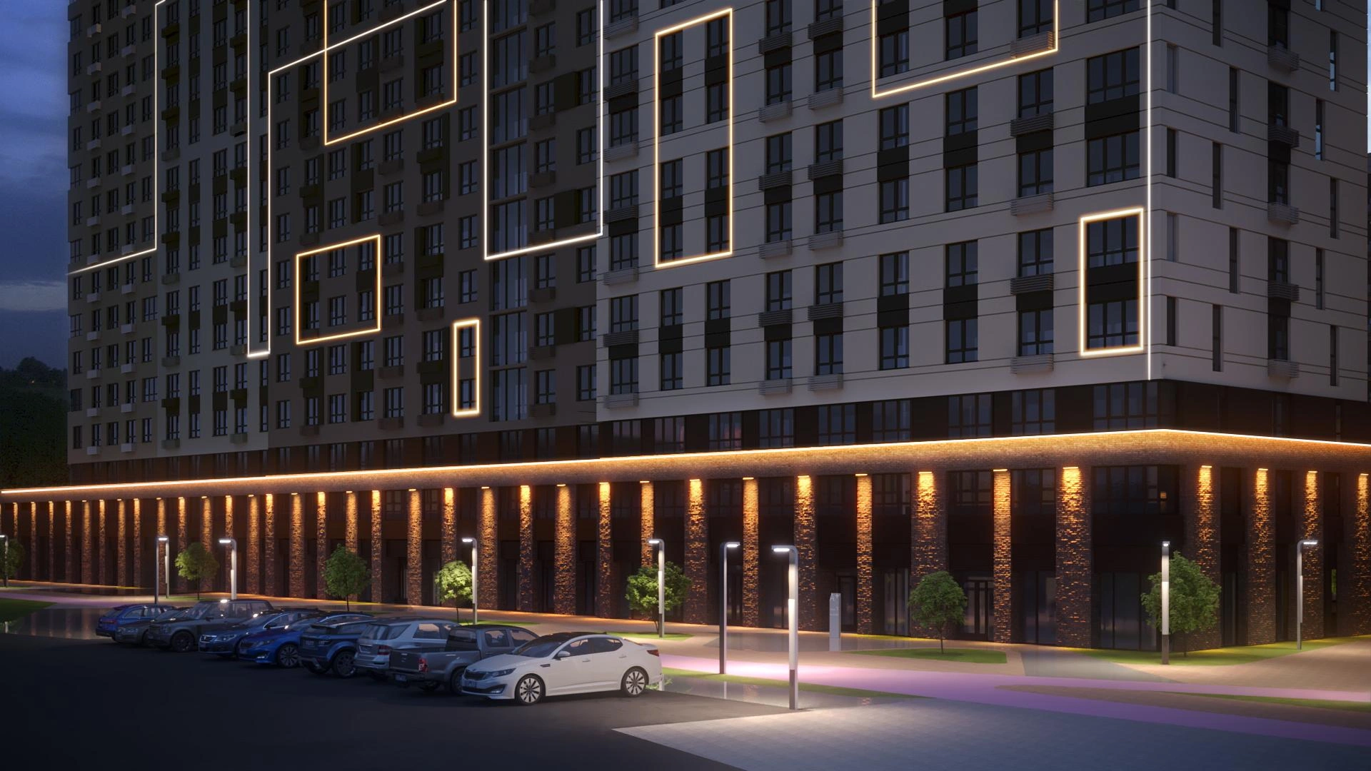 С помощью архитектурной подсветки девелопер передает уникальный характер жилого квартала «А+». Простые эффектные приемы с неярким теплым освещением, интегрированным в фасадные решения, создают мягкий, рассеянный, бережный свет, который не будет вторгаться в окна жителей и тревожить их покой, но при этом четко обозначает контуры и фактуру домов.
