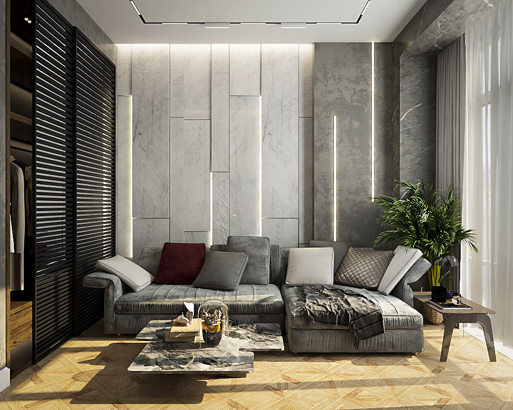 - Акцентные стены. Одна стена с выразительными обоями или фактурной штукатуркой добавляет разнообразия, но не перегружает пространство.