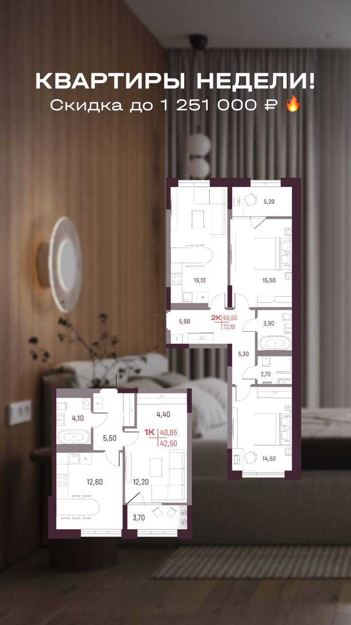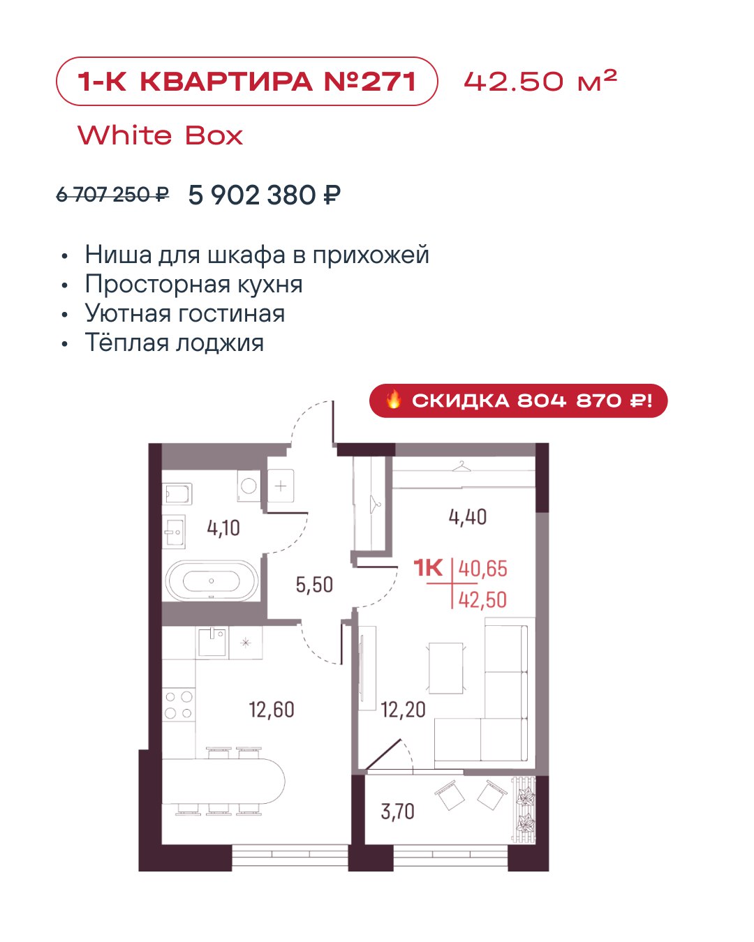 - 1-к квартира 42.50 м² со скидкой 804 870 ₽.