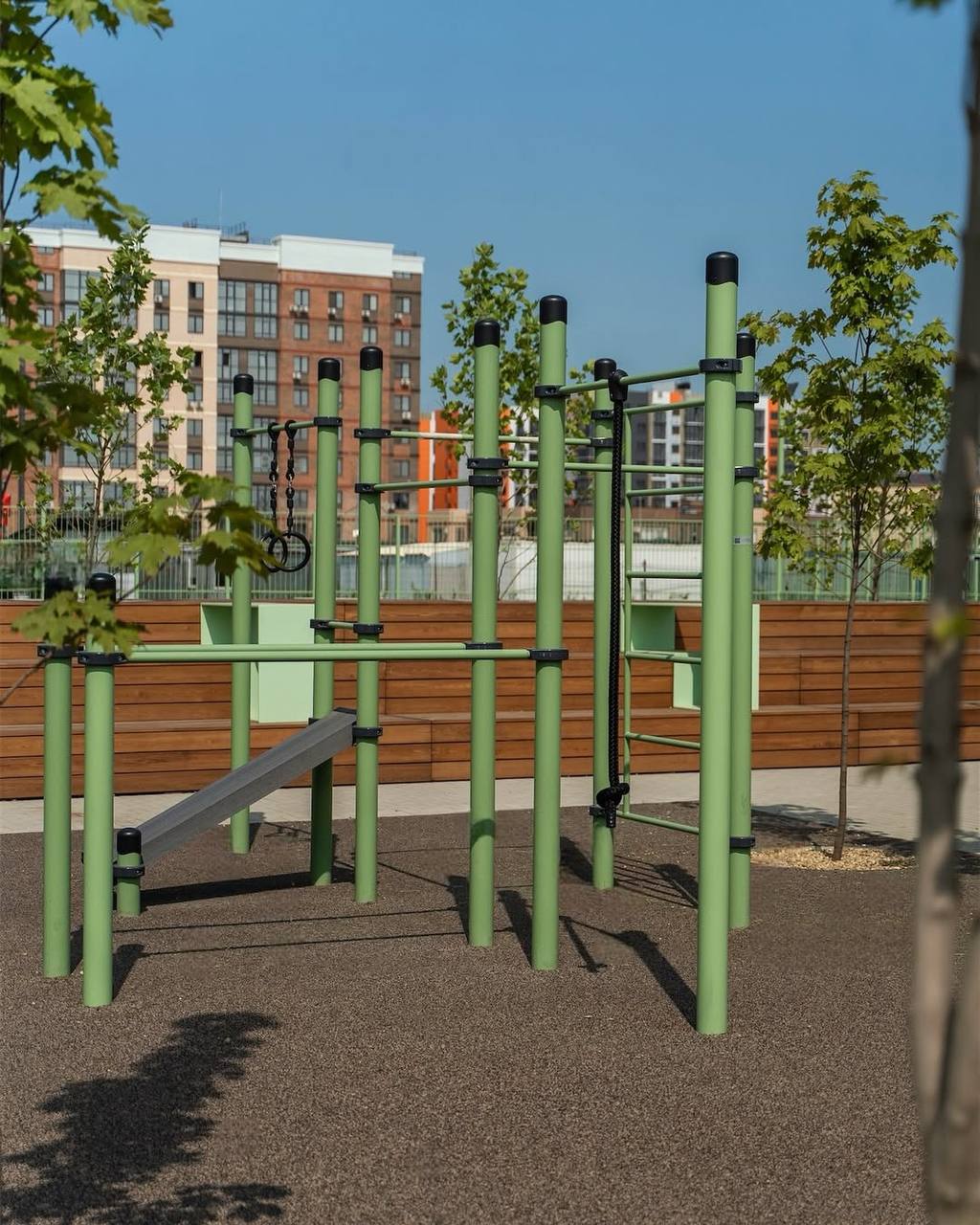 - В воркаут-зоне установили турники, гимнастические брусья, скамьи для пресса, шведские стенки, рукоходы и другие элементы от Kenguru Pro