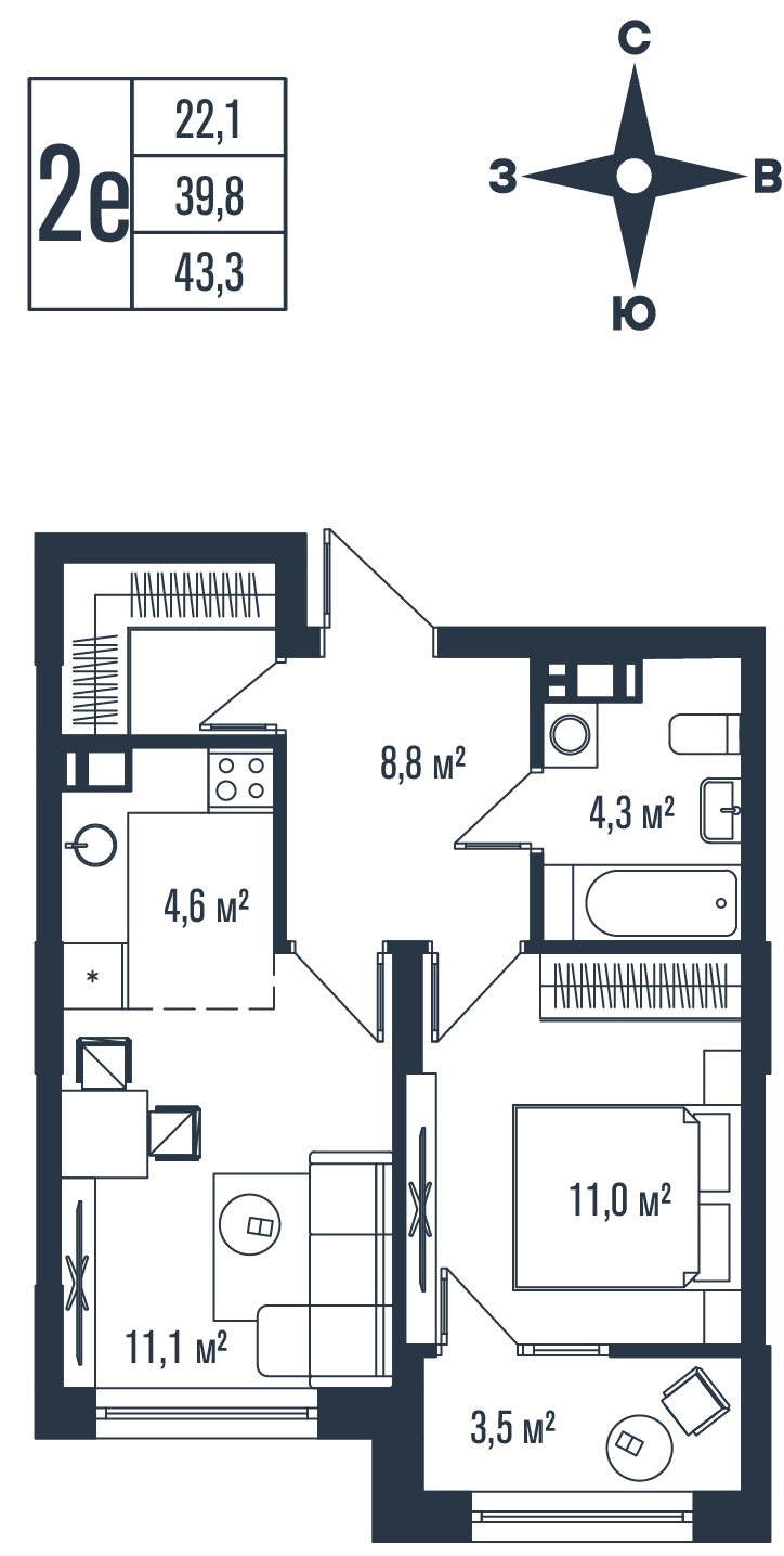 Общая площадь 43.3 м²