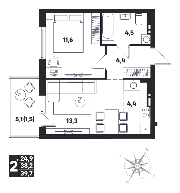 Общая площадь 39.7 м²