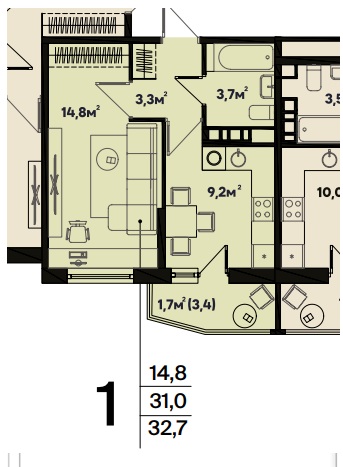Общая площадь 32.7 м²