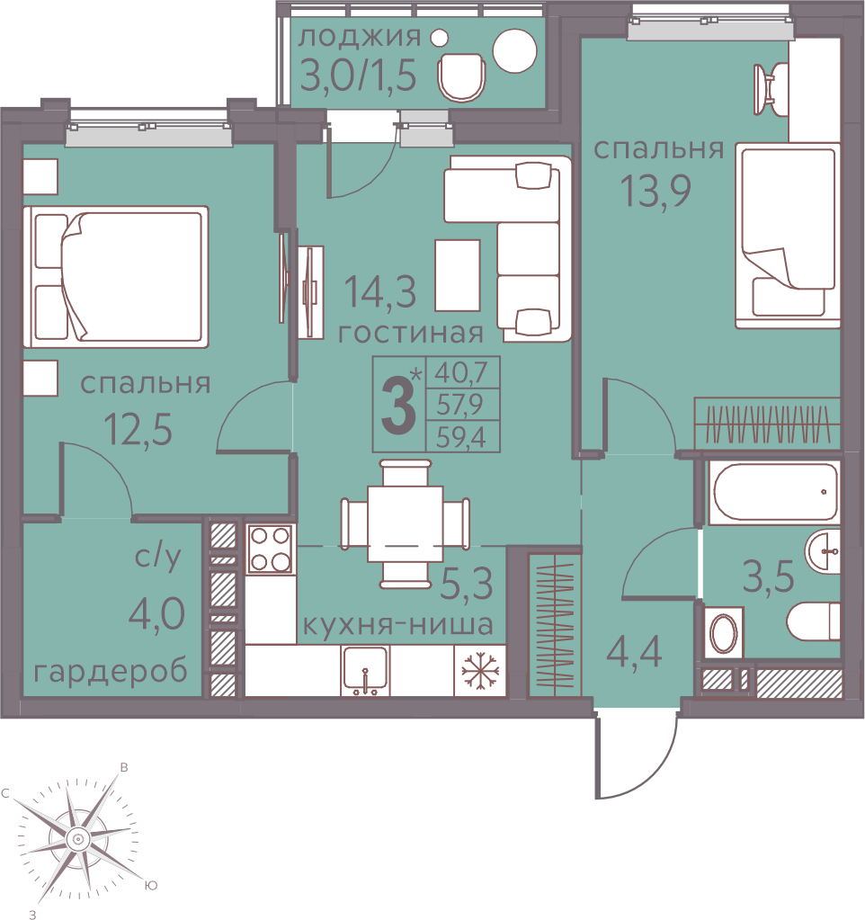 Общая площадь 59.4 м²