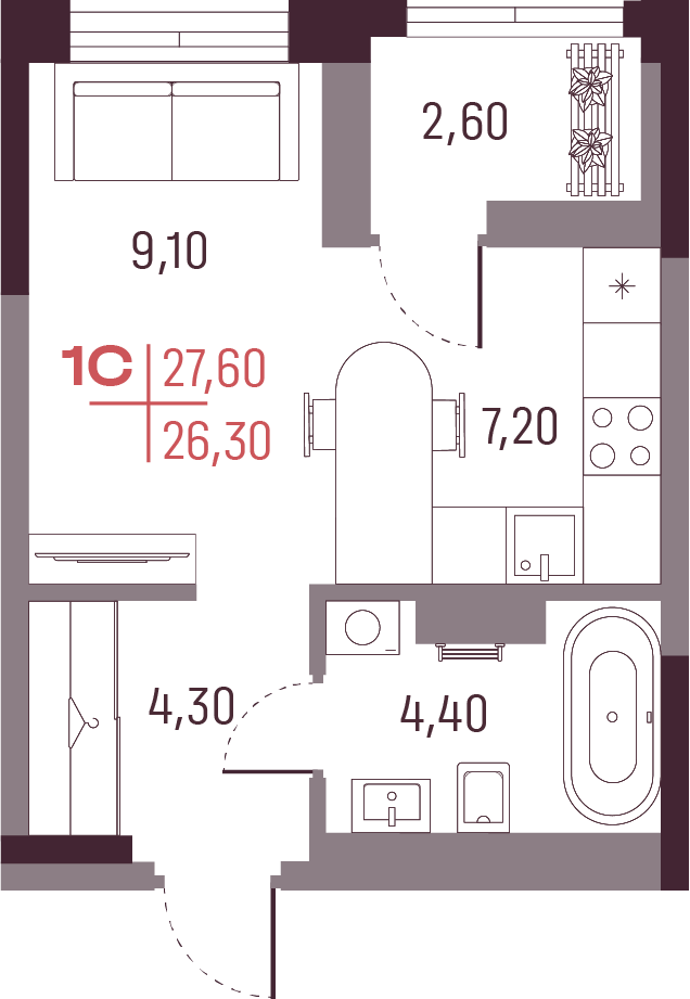 Общая площадь 26.3 м²