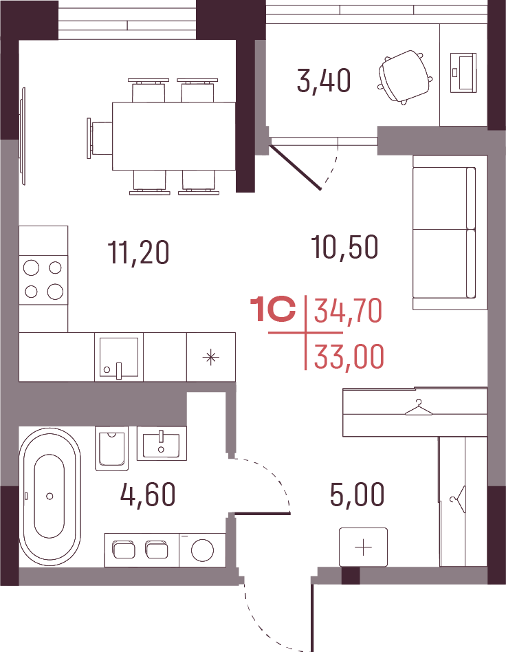 Общая площадь 33 м²