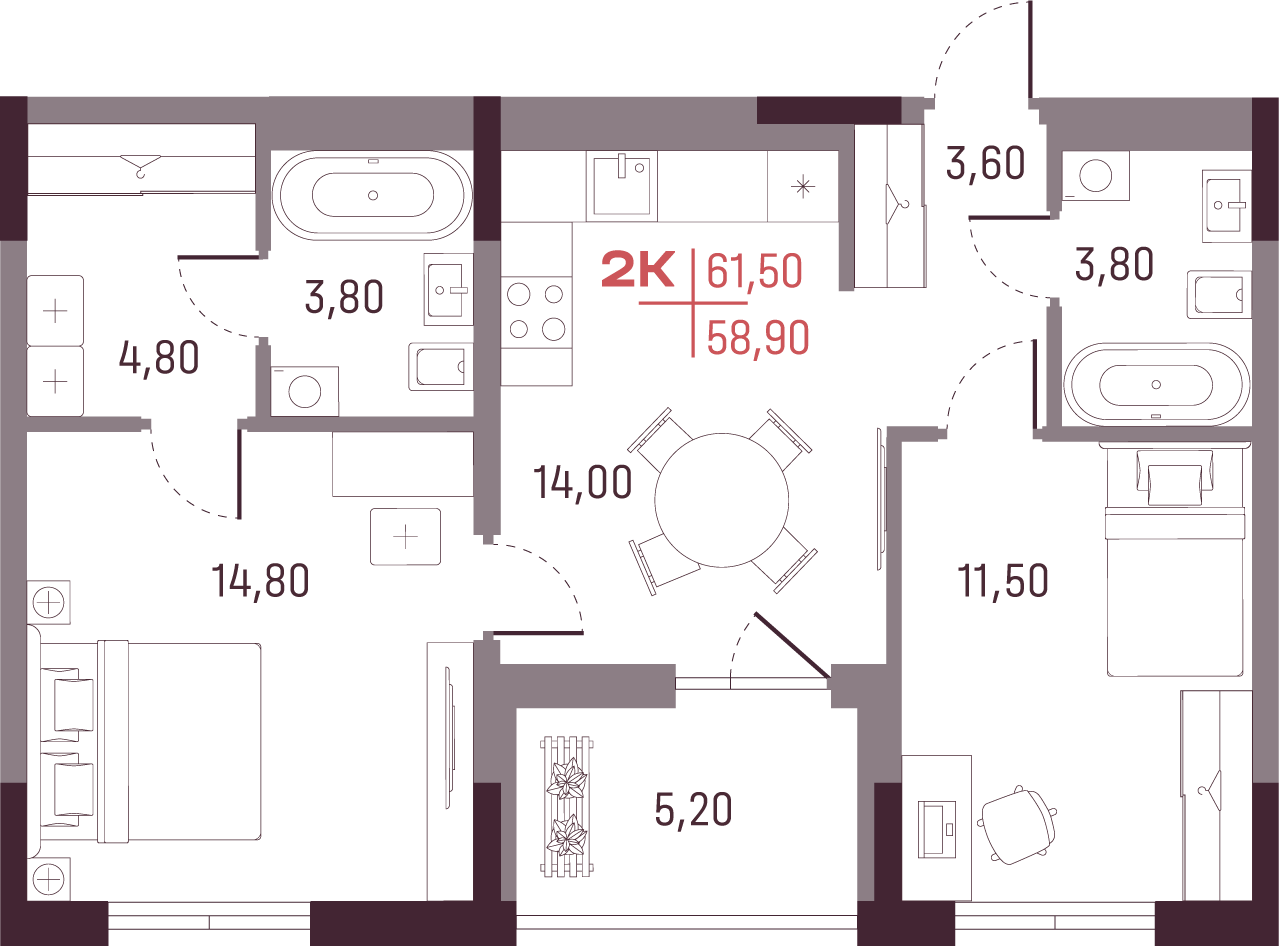 Общая площадь 58.9 м²
