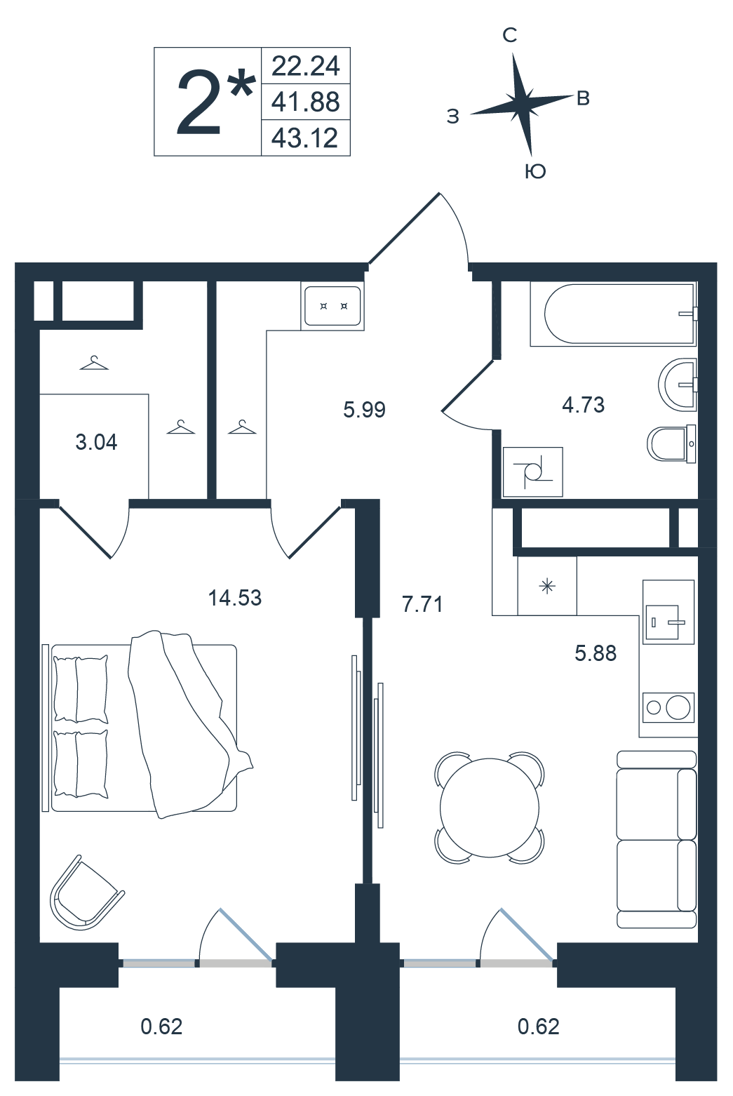 Общая площадь 43.12 м²