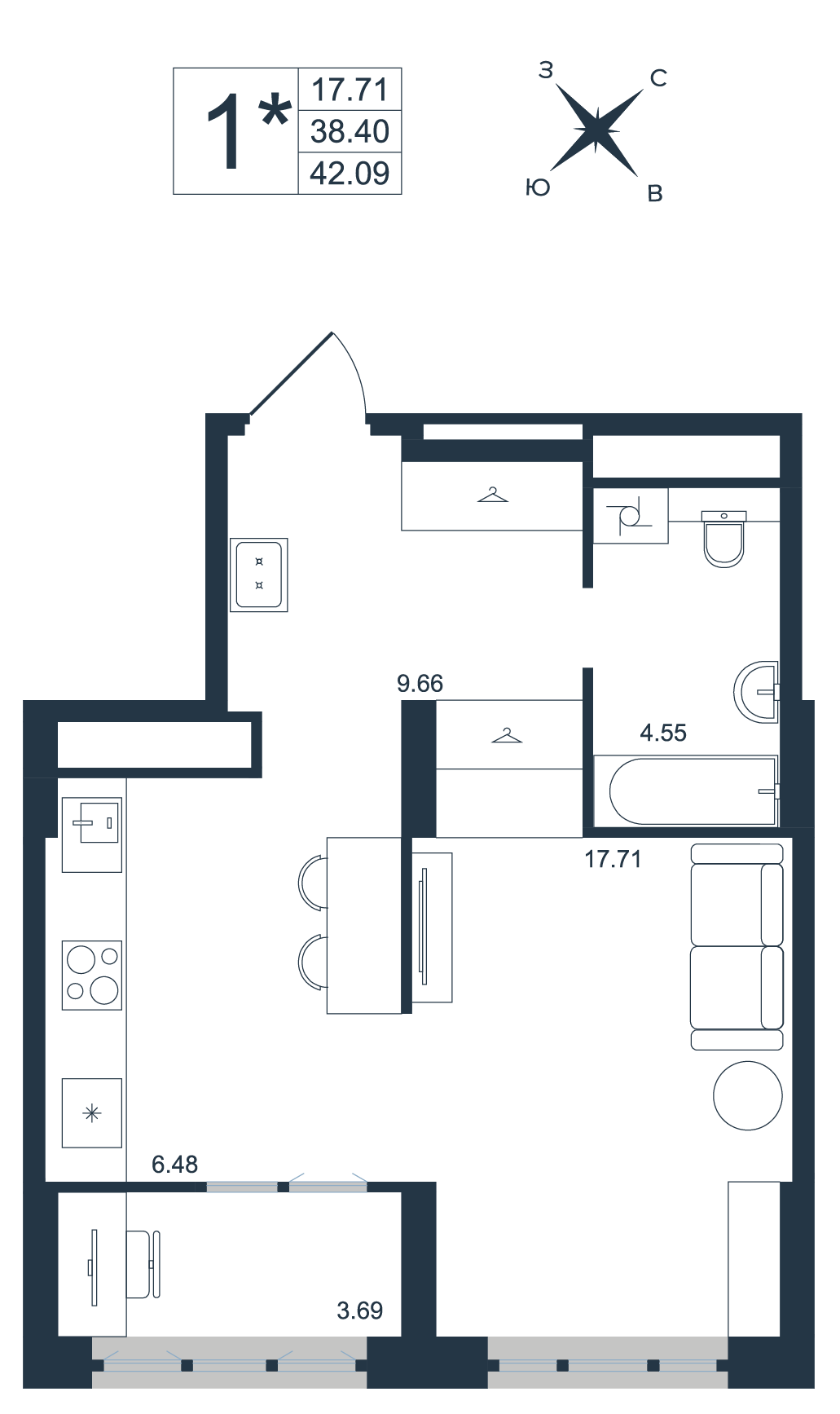 Общая площадь 45.58 м²