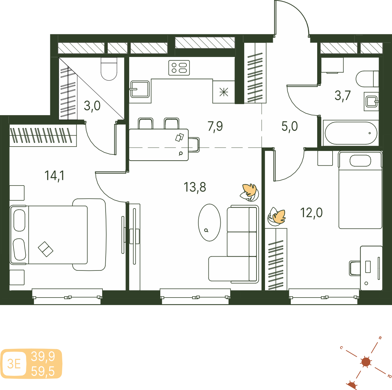 Общая площадь 59.5 м²