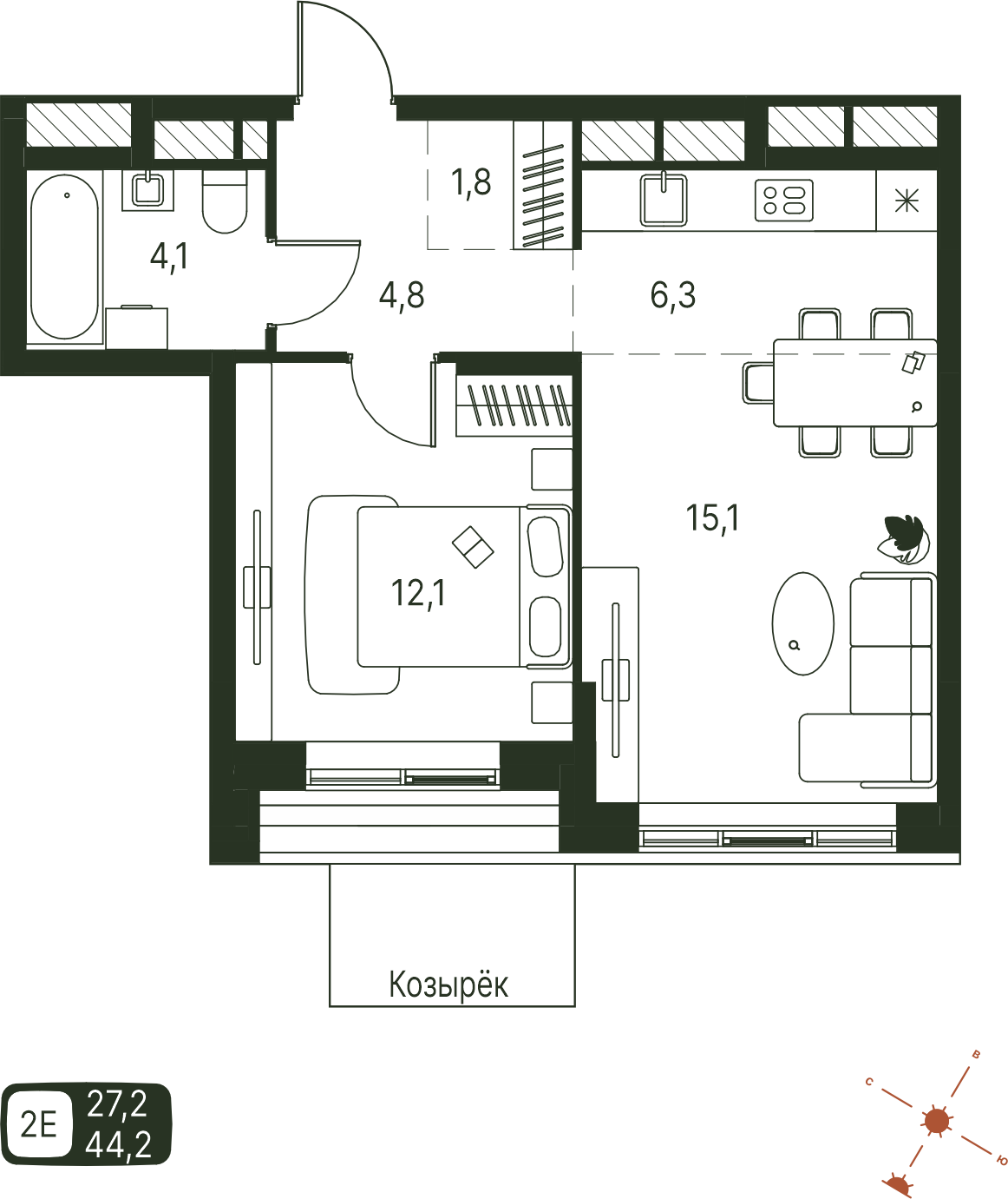 Общая площадь 44.2 м²