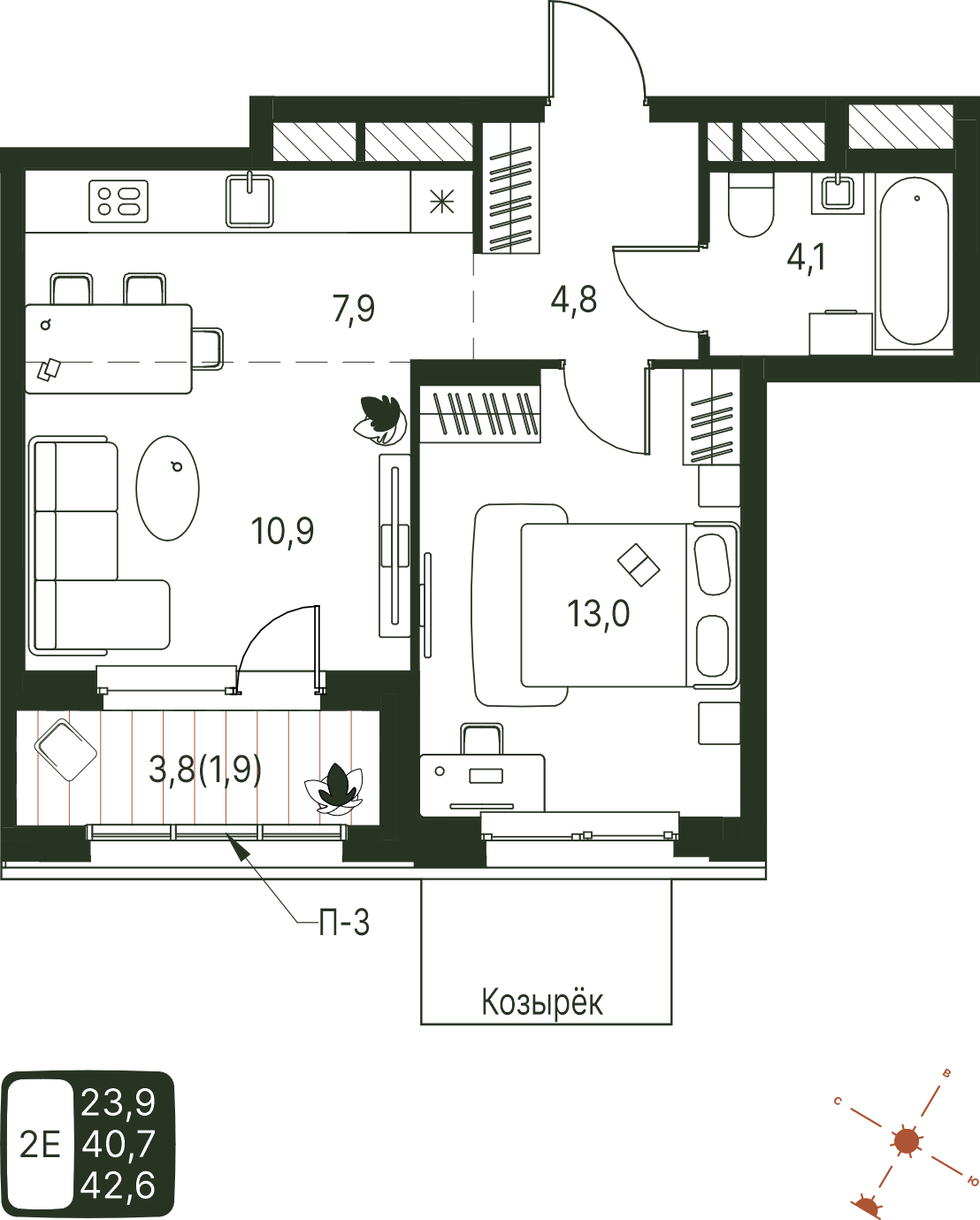 Общая площадь 42.6 м²