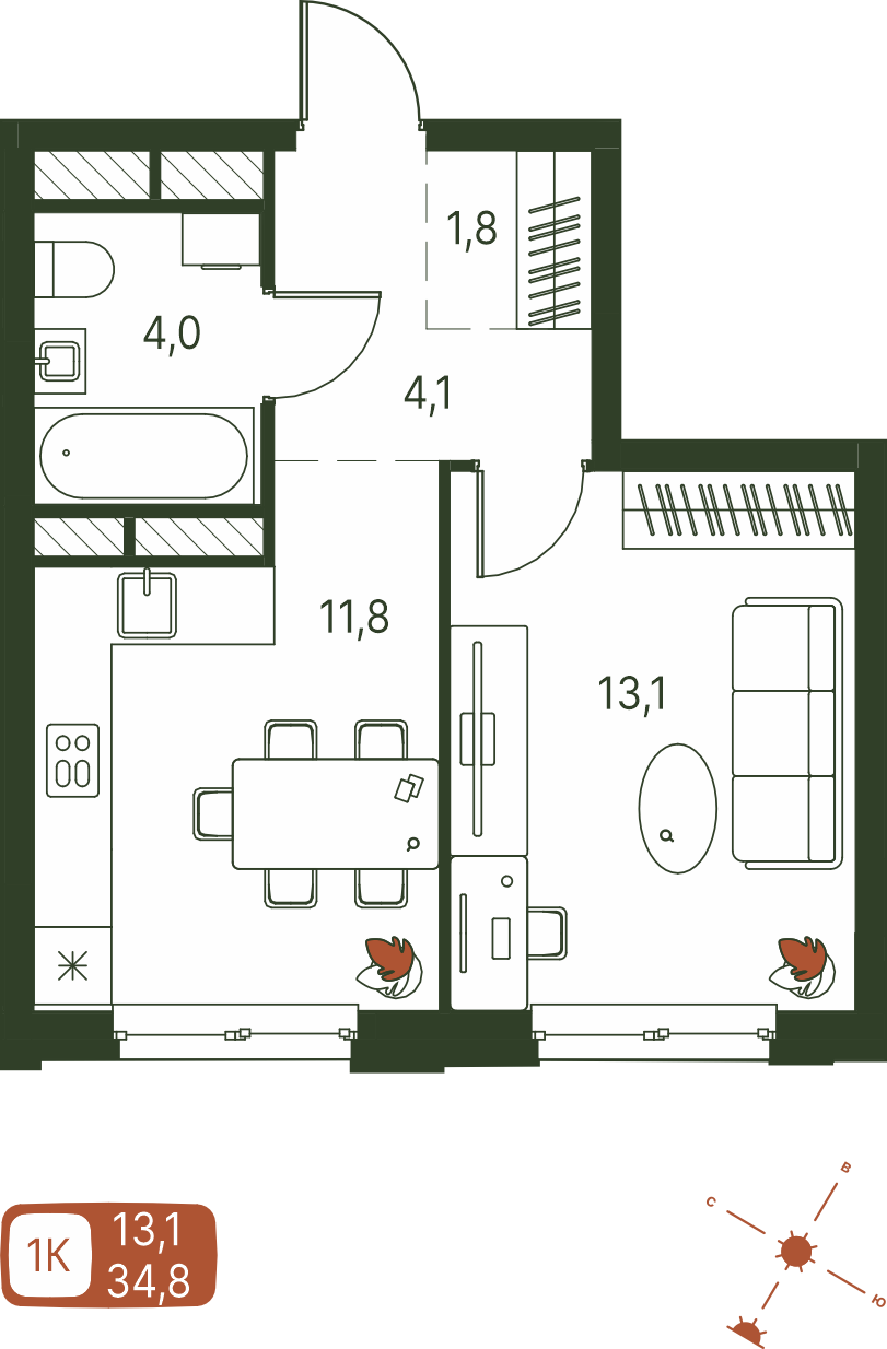 Общая площадь 34.8 м²
