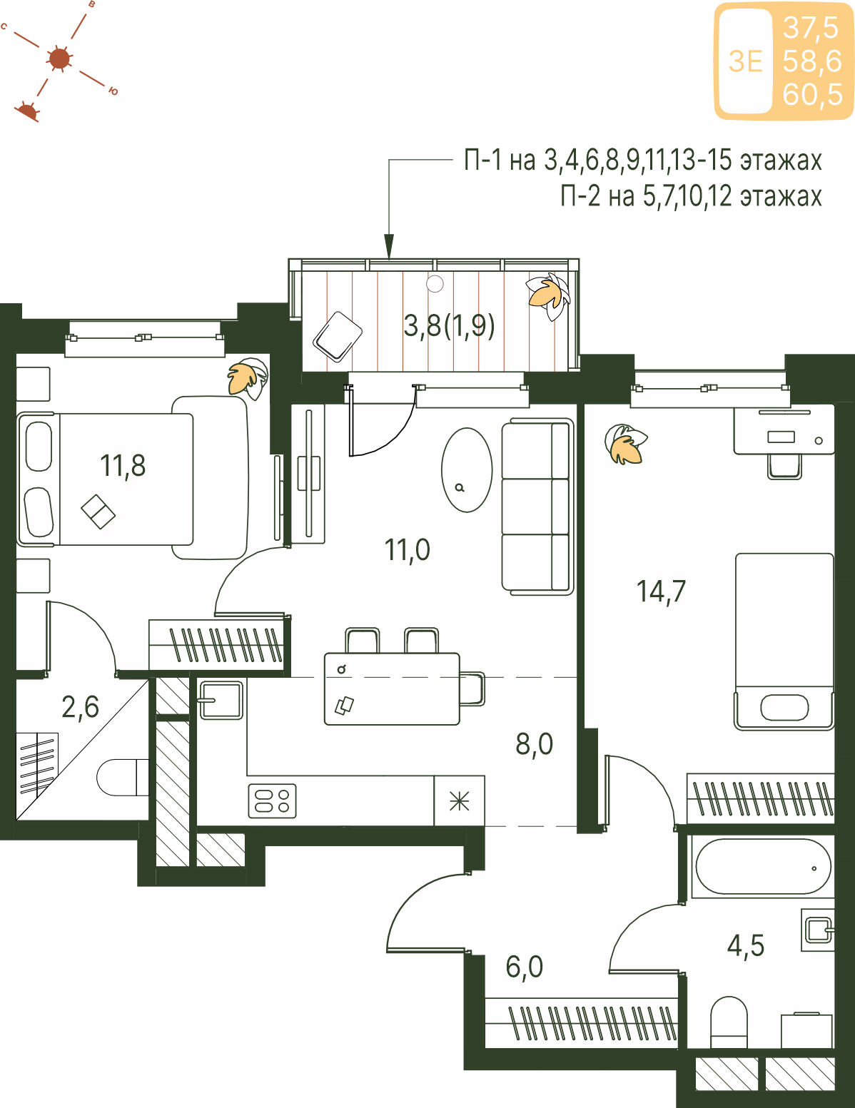 Общая площадь 60.5 м²