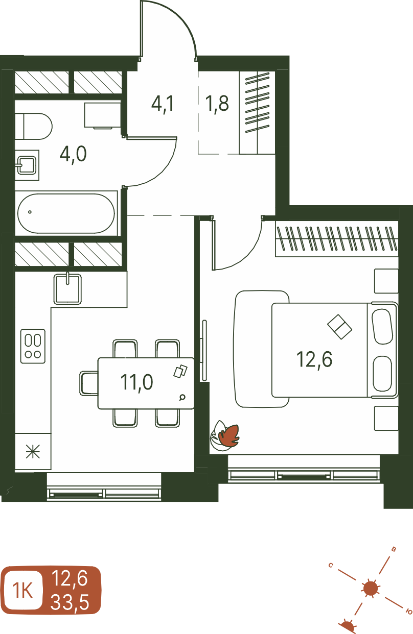 Общая площадь 33.5 м²
