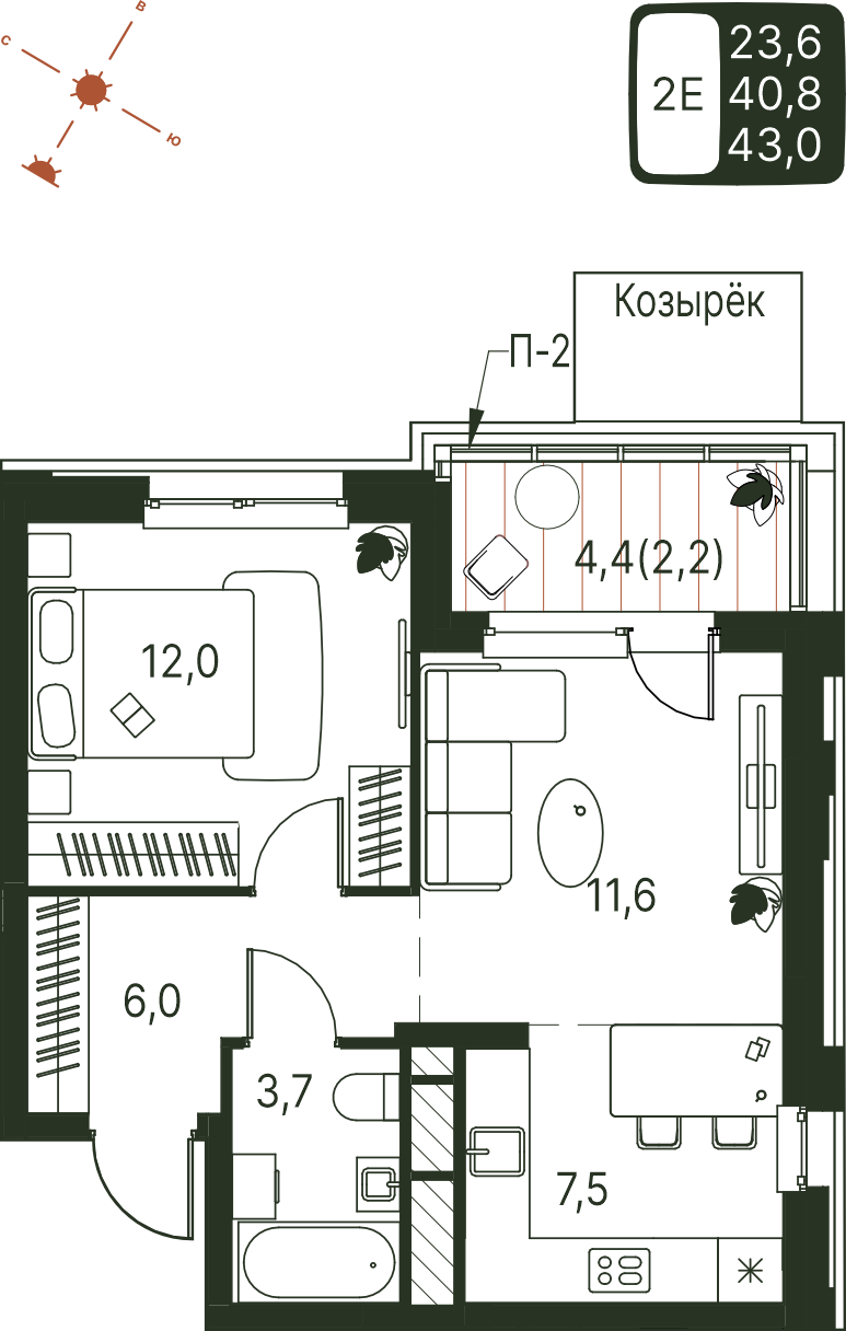 Общая площадь 43 м²