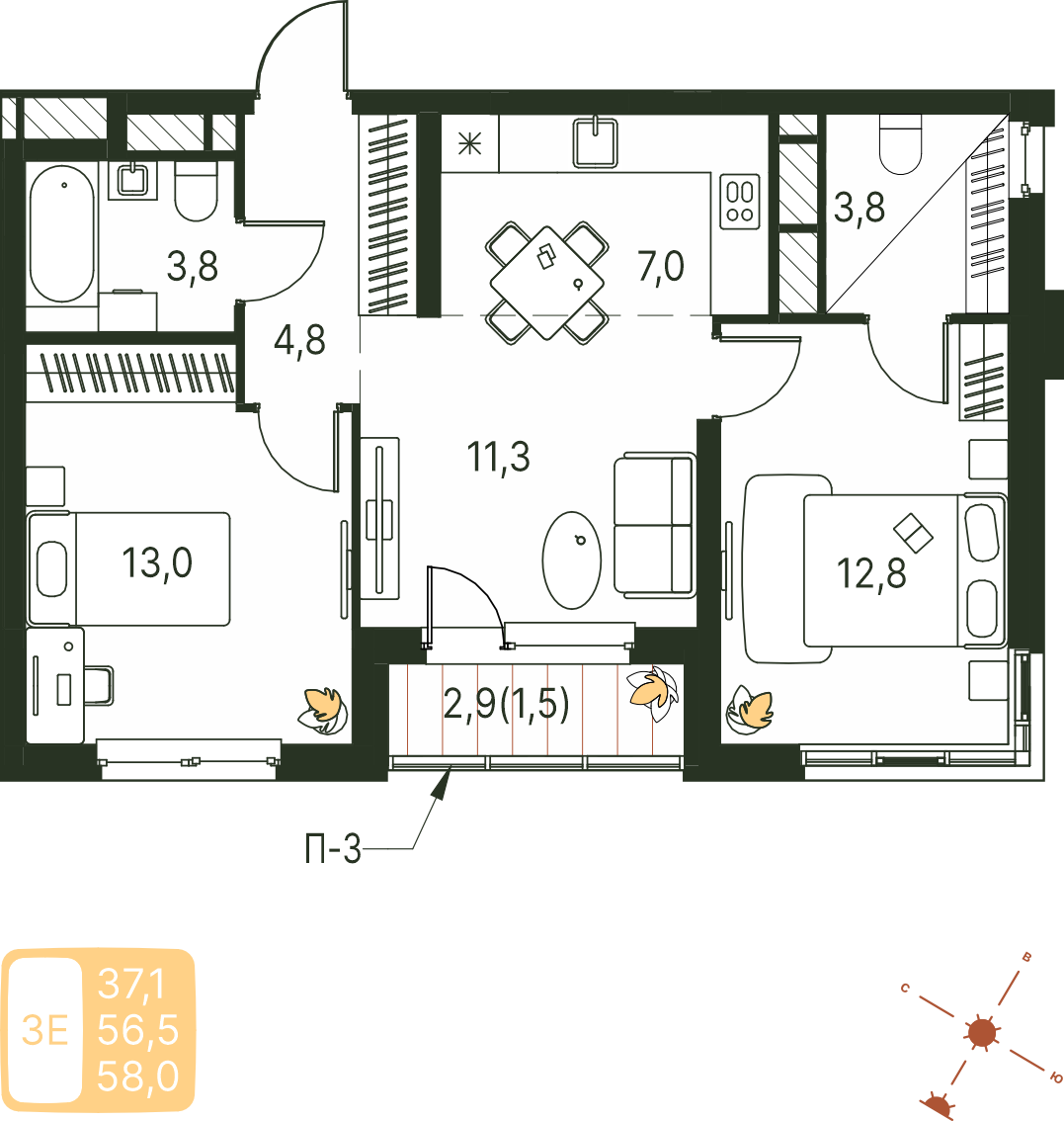 Общая площадь 58 м²