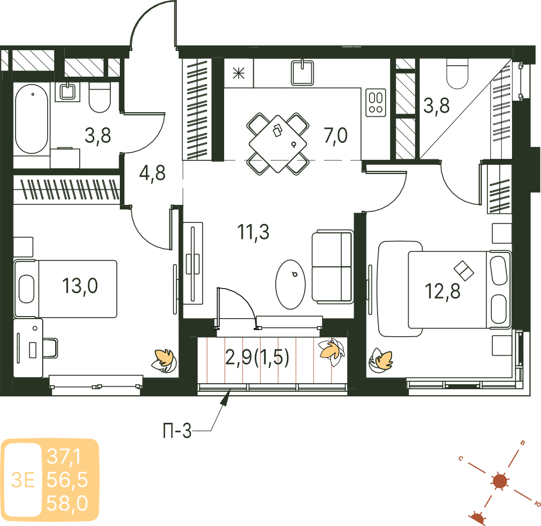 Общая площадь 58 м²