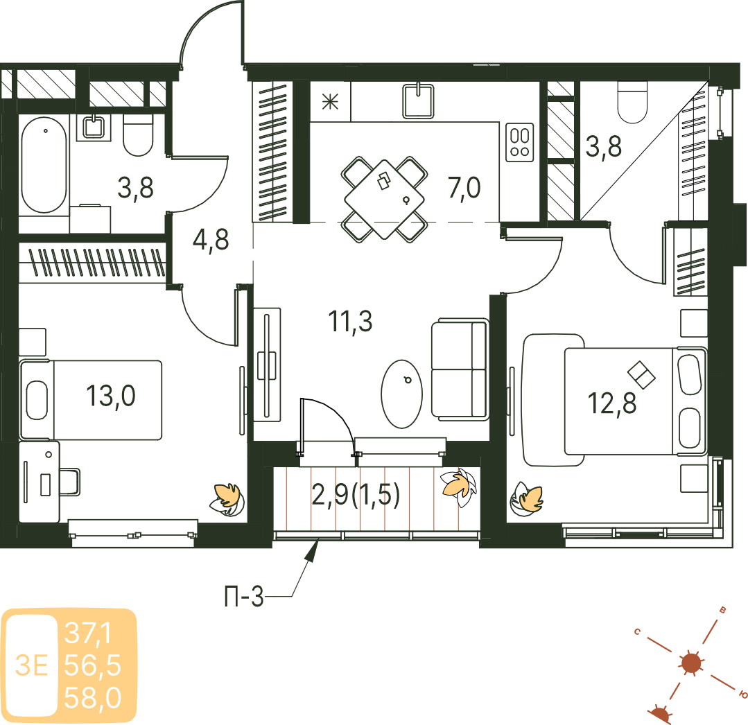 Общая площадь 58 м²