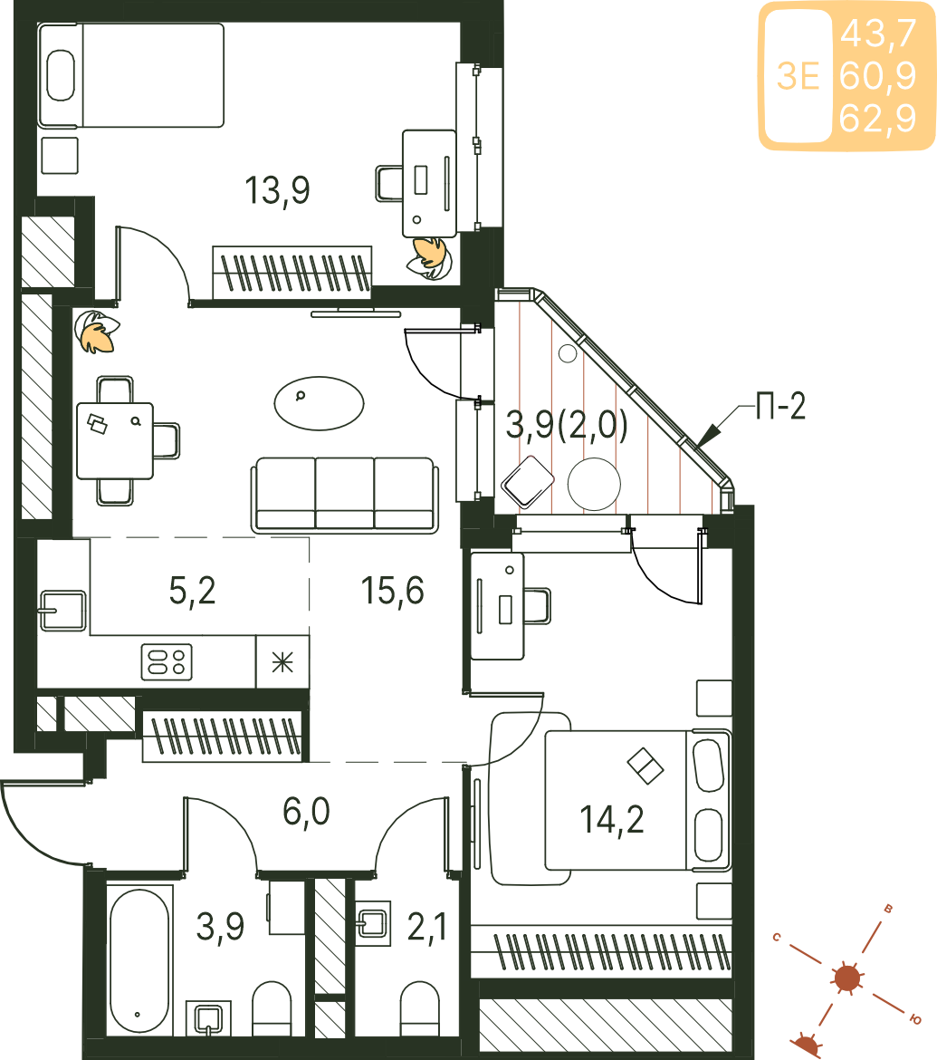 Общая площадь 62.9 м²