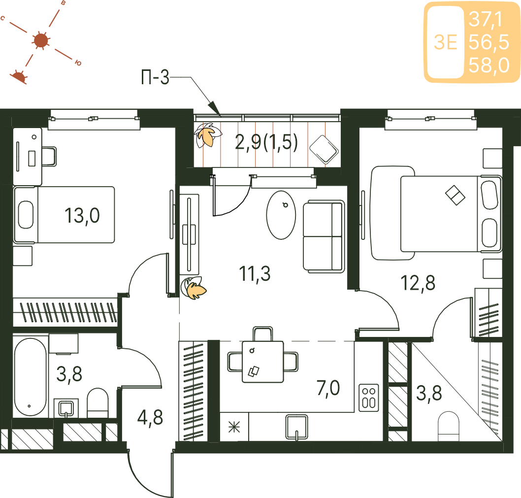 Общая площадь 58 м²