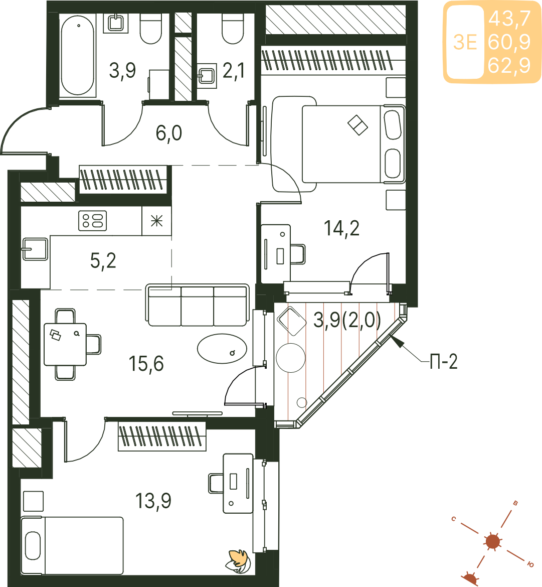 Общая площадь 62.9 м²