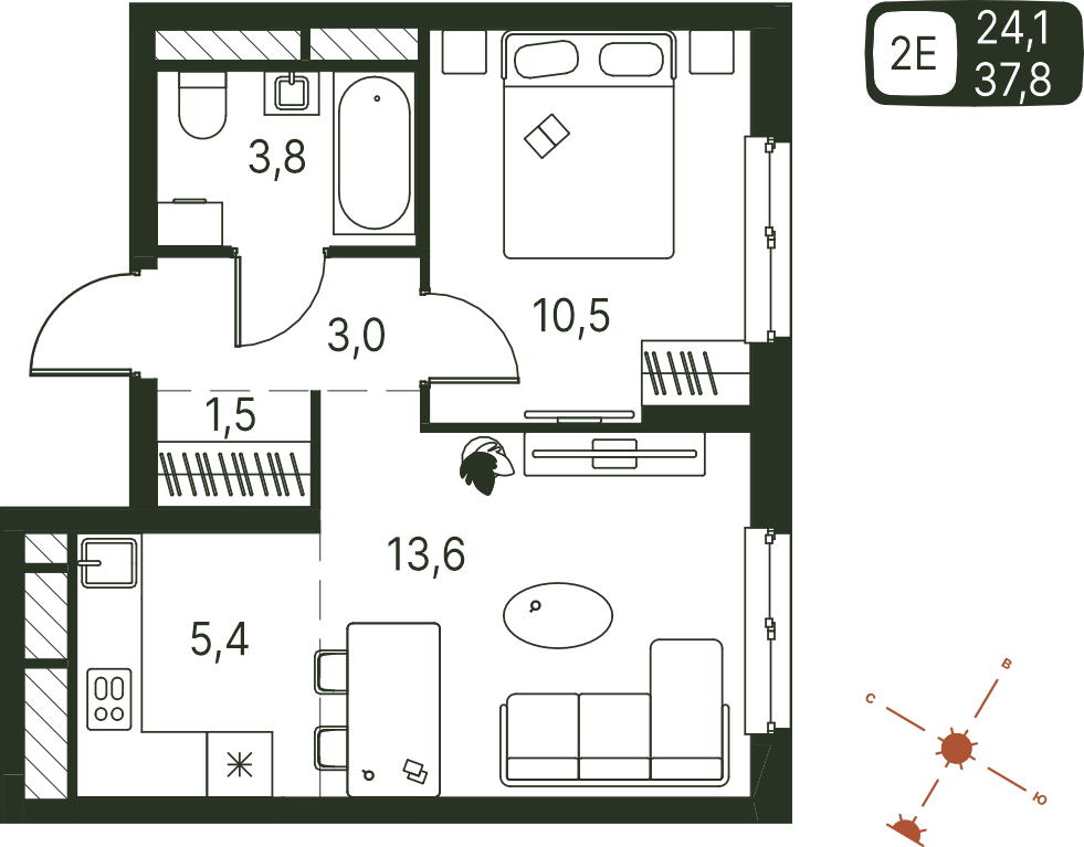 Общая площадь 37.8 м²