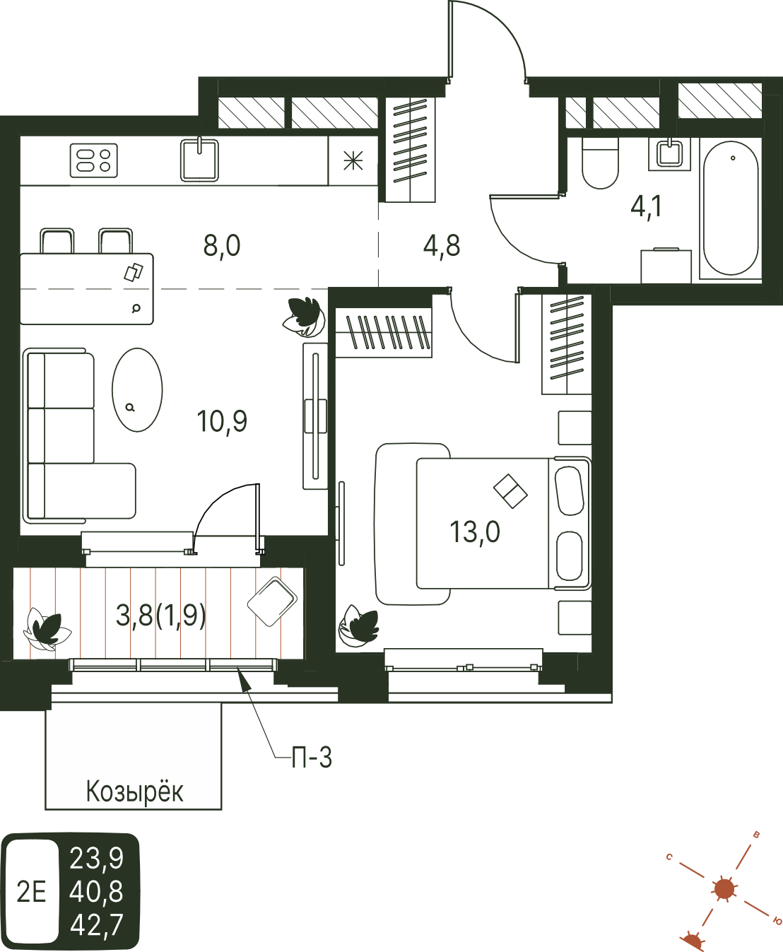 Общая площадь 42.7 м²