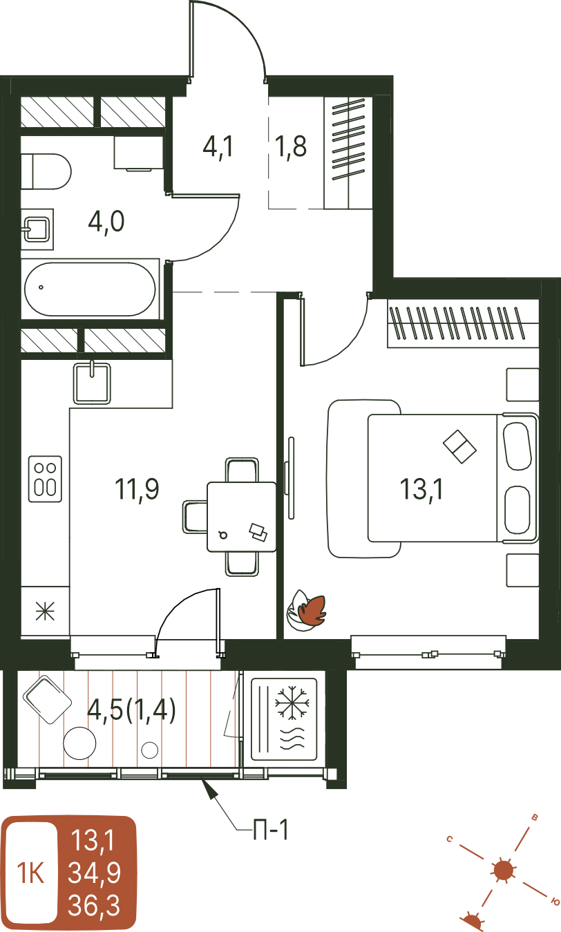 Общая площадь 36.3 м²