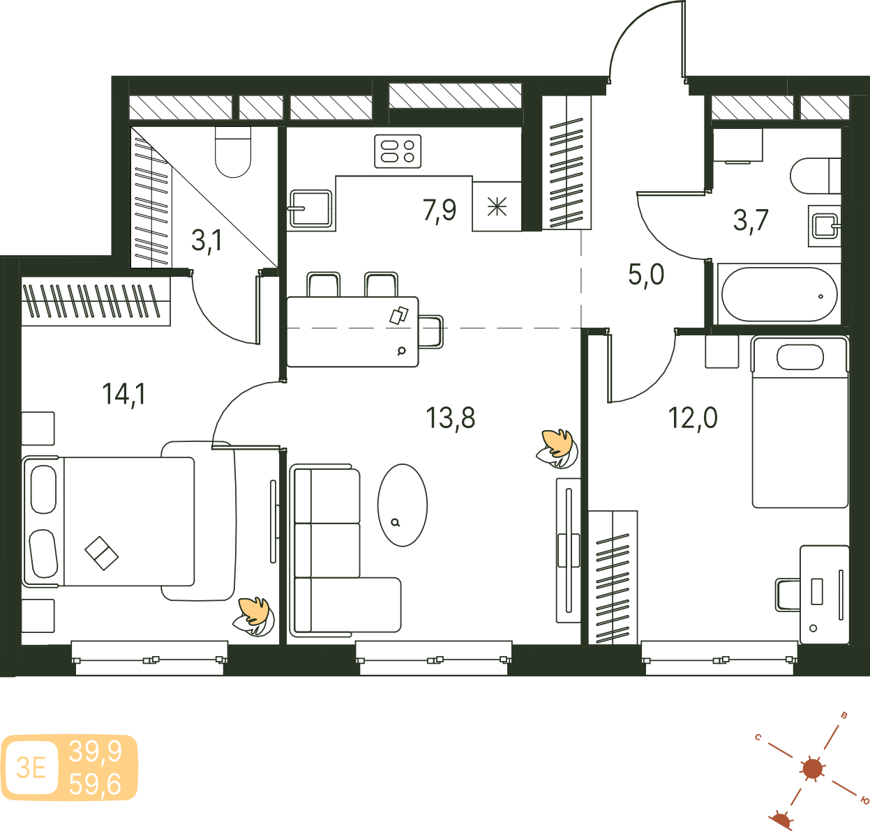 Общая площадь 59.6 м²