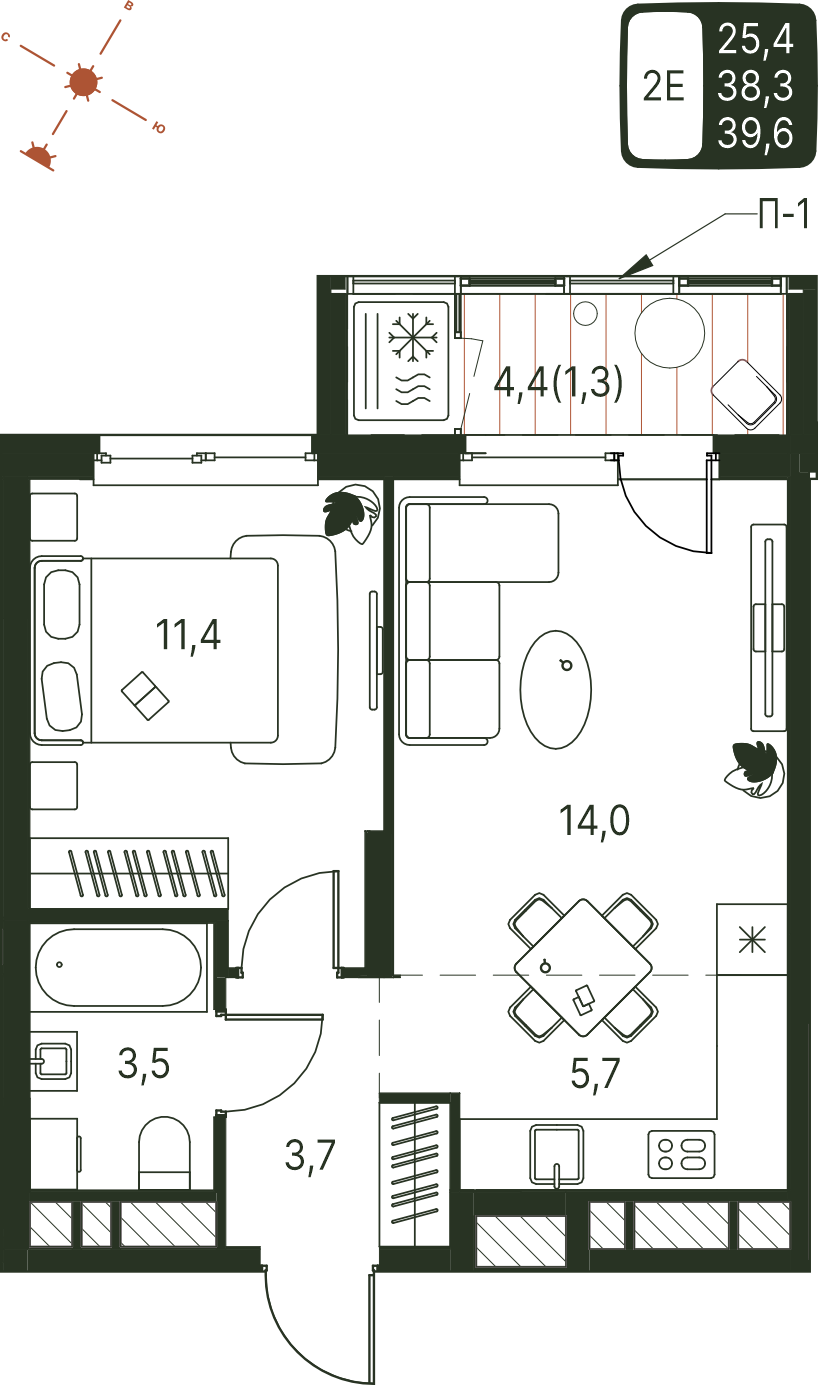 Общая площадь 39.6 м²