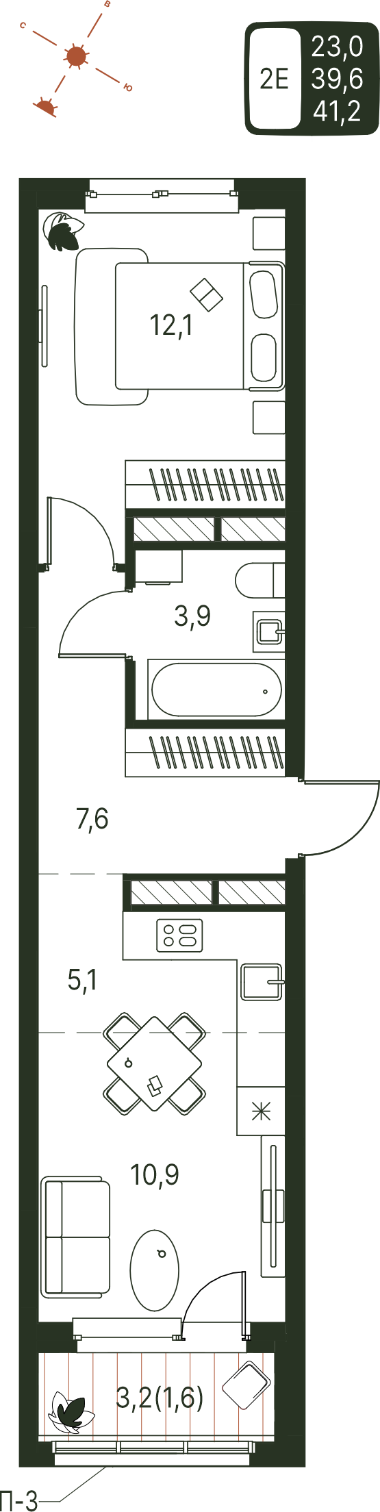Общая площадь 41.2 м²
