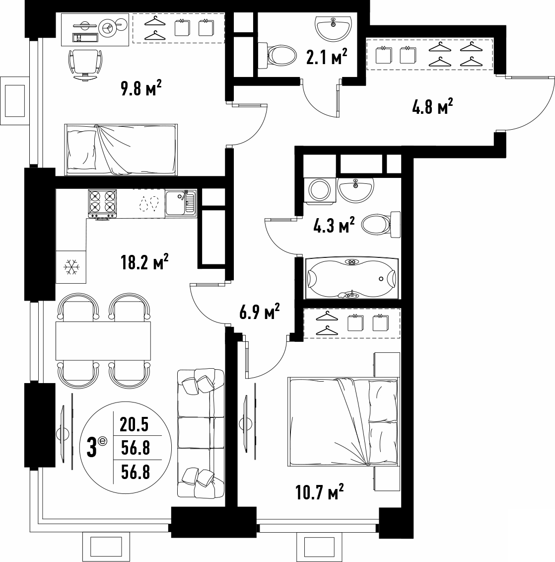 Общая площадь 55.1 м²