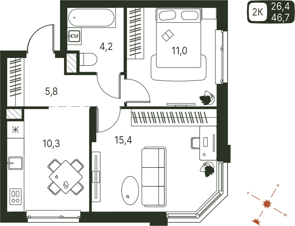 Общая площадь 46.7 м²