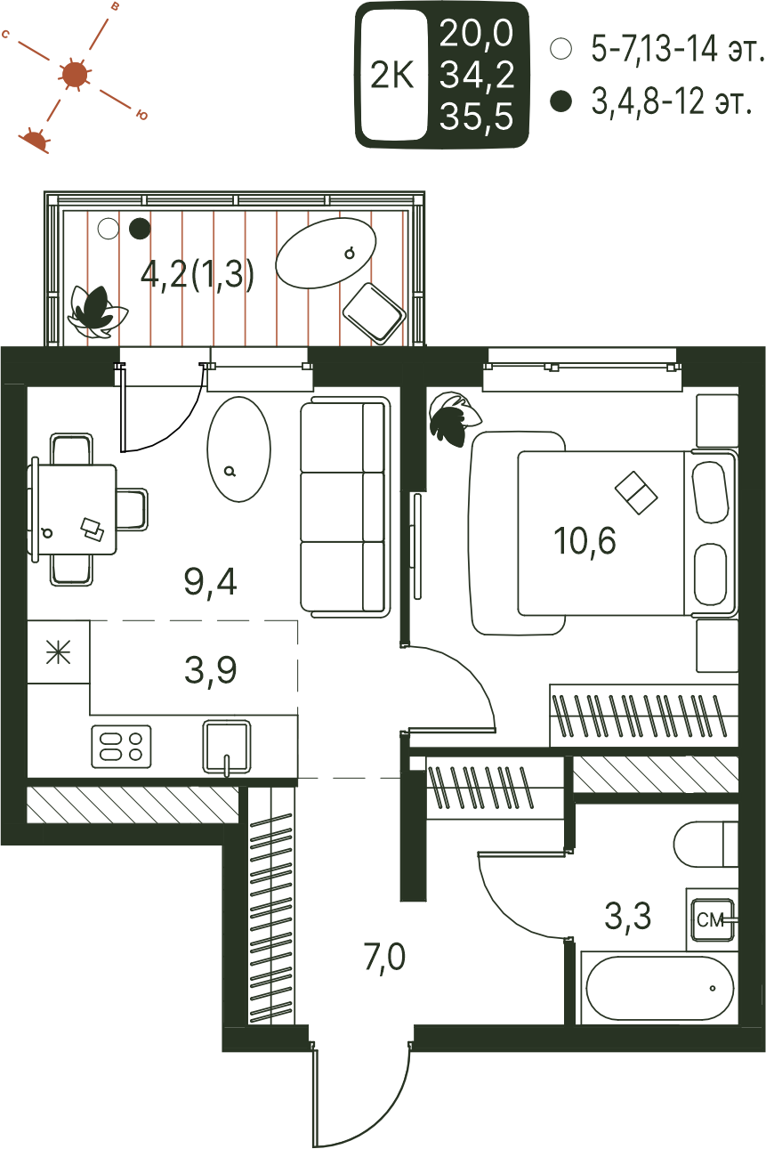 Общая площадь 35.5 м²