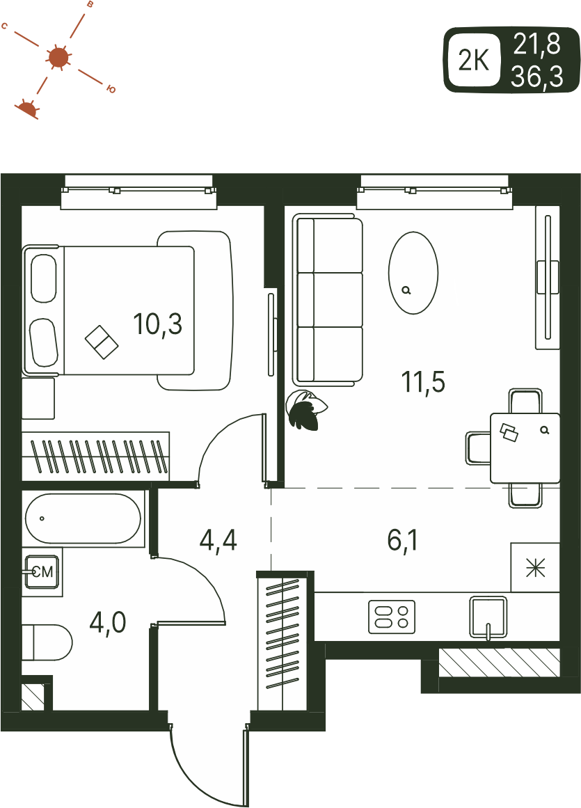 Общая площадь 36.3 м²