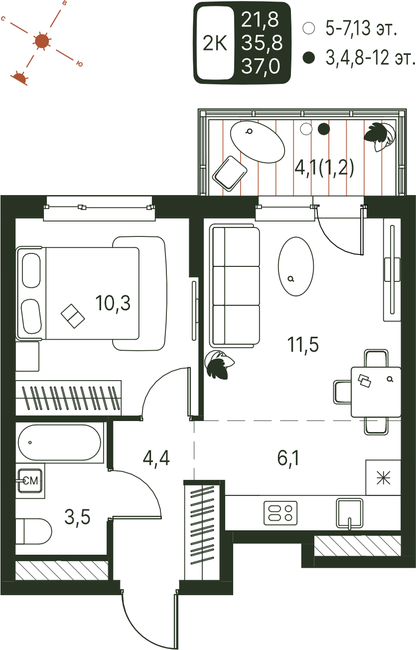 Общая площадь 37 м²