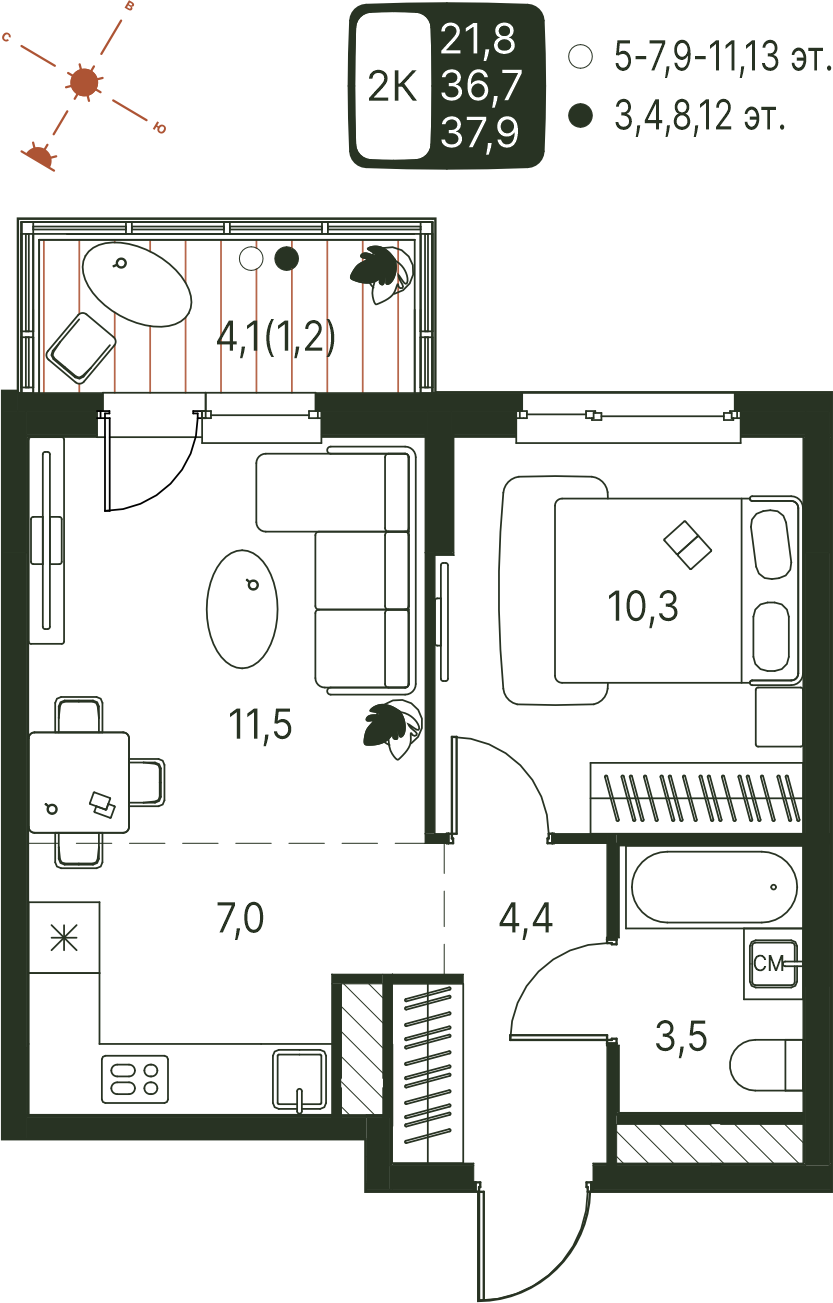 Общая площадь 37.9 м²