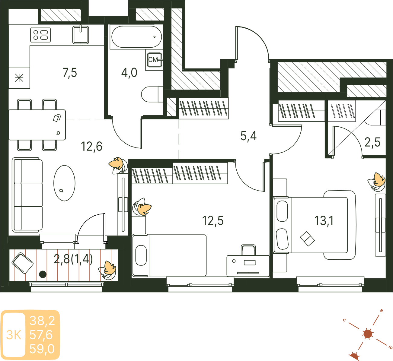 Общая площадь 59 м²