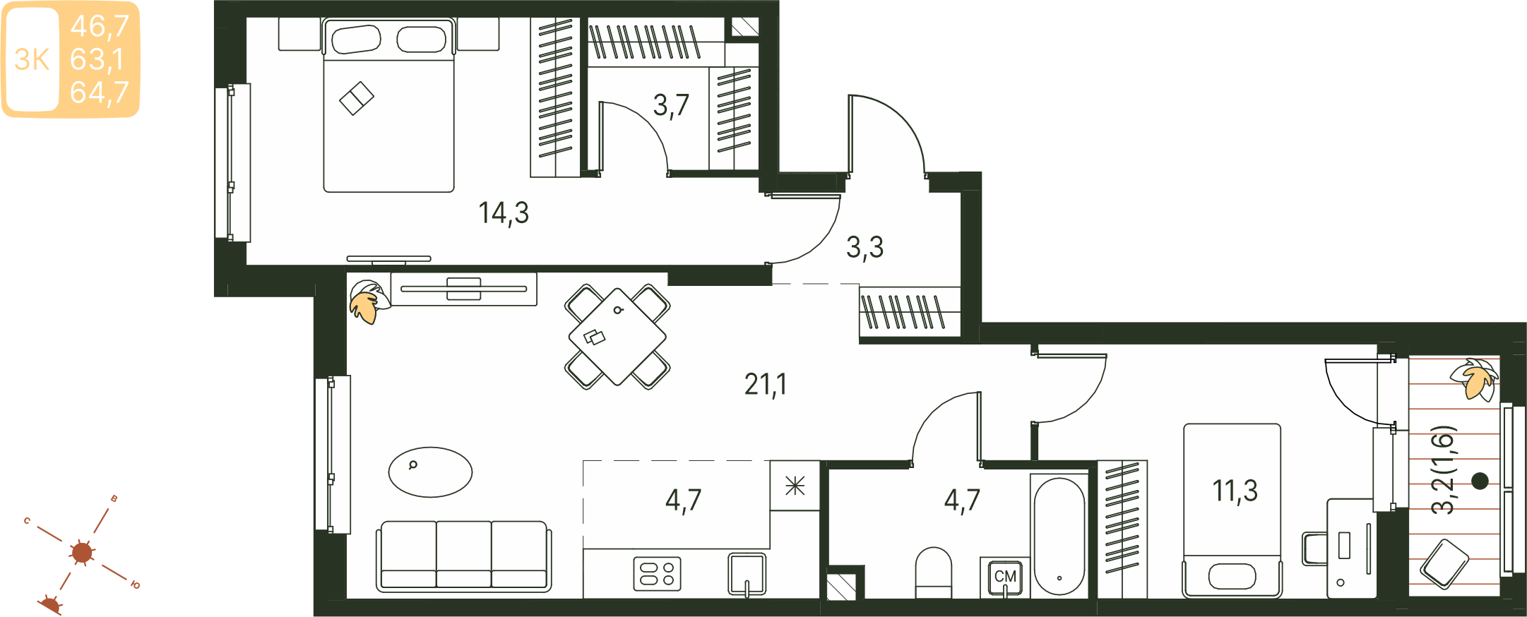 Общая площадь 64.7 м²