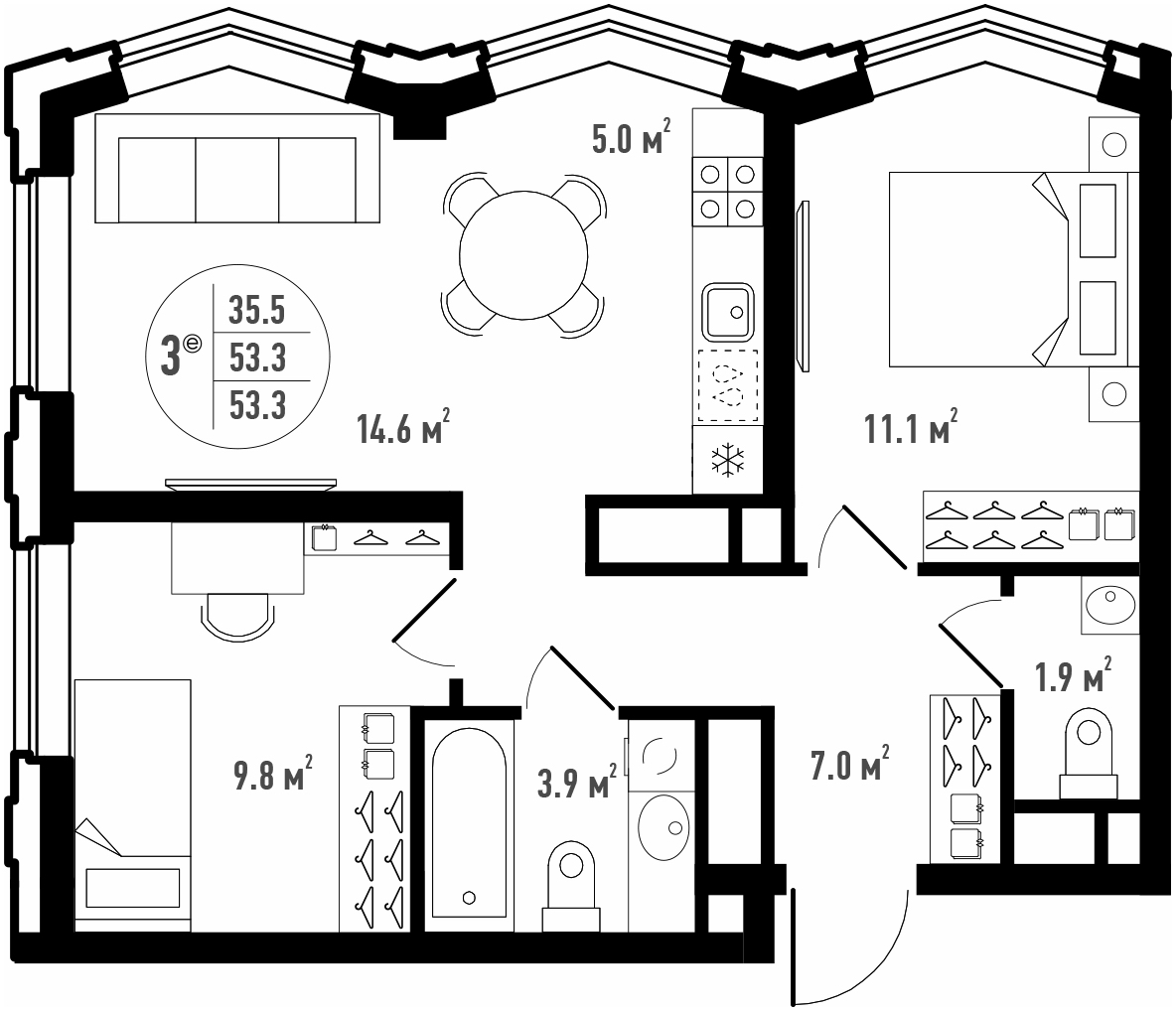 Общая площадь 53.3 м²